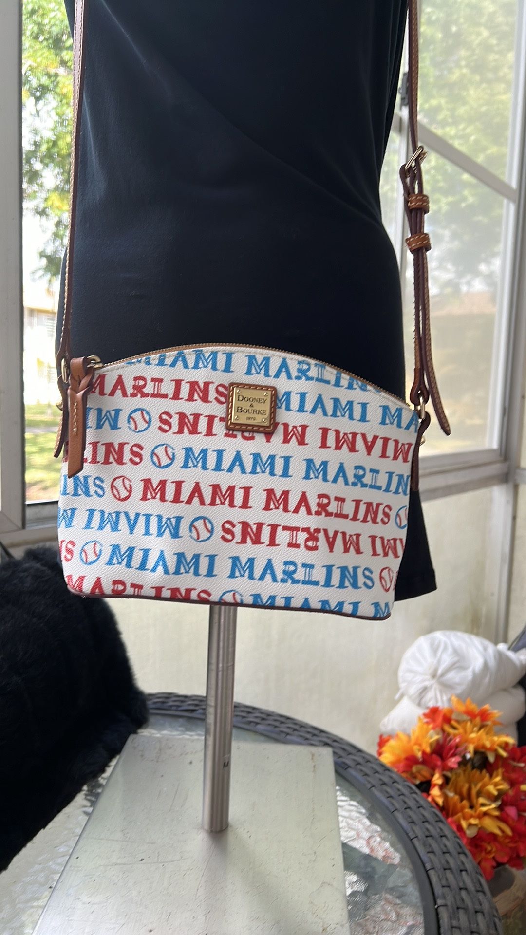 Brand new Dooney crossbody bag featuring Miami marlins baseball Comes with registration card for Dooney as shown Bag measures 10” x 7” x 4” depth with super long adjustable crossbody strap