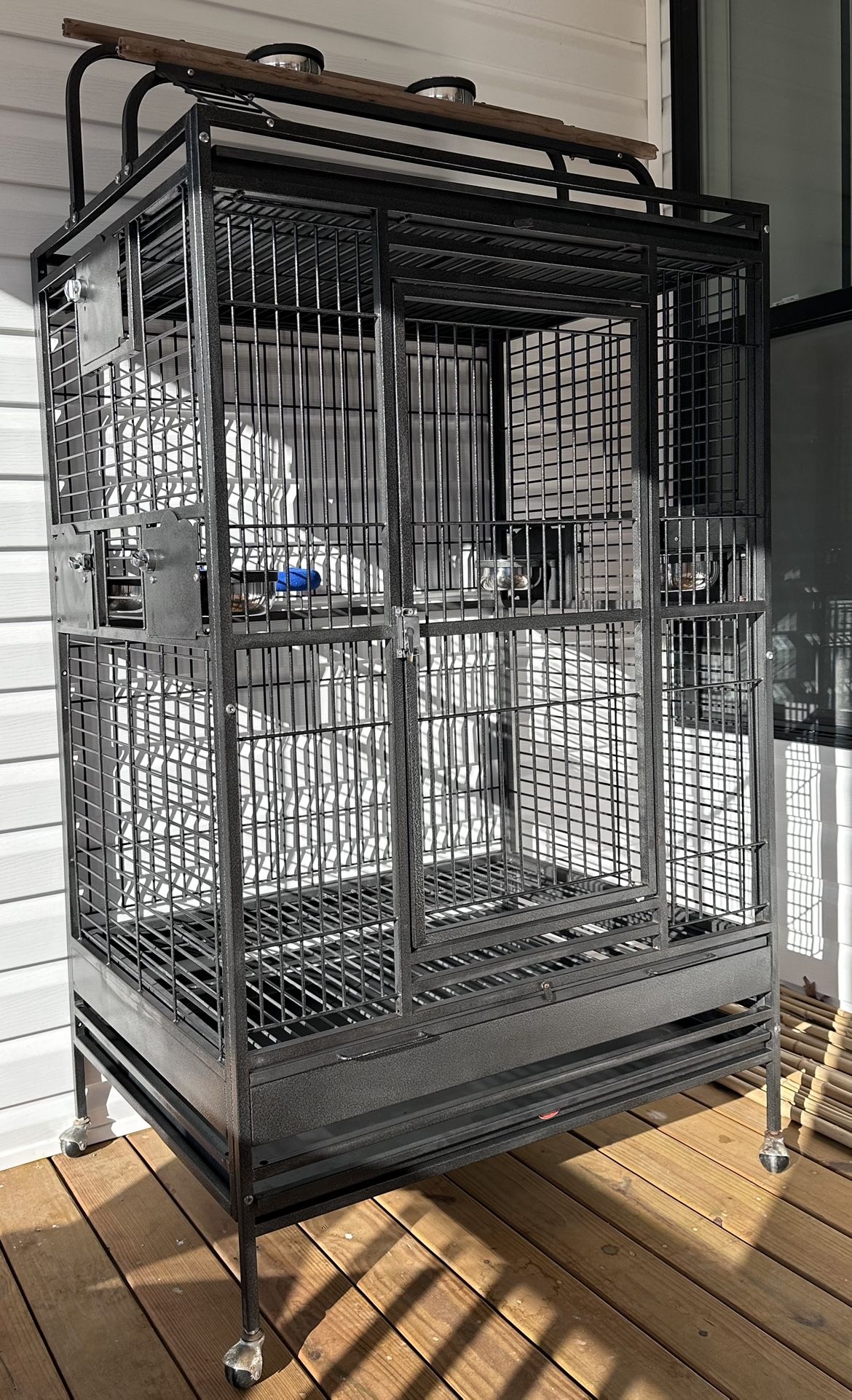 Good condition. Outside approximate measurements: 30” deep, 40” wide, 76.5” high. Interior - 29” deep, 38.5” wide, 52.5” high. Four stainless steel interior large bowls . Two stainless steel small bowls for top perch area.