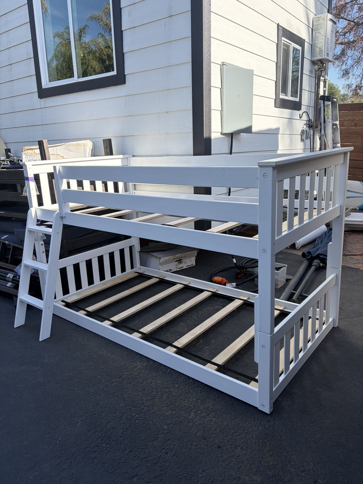 White Wood Twin over Twin Floor Bunk Bed with Ladder