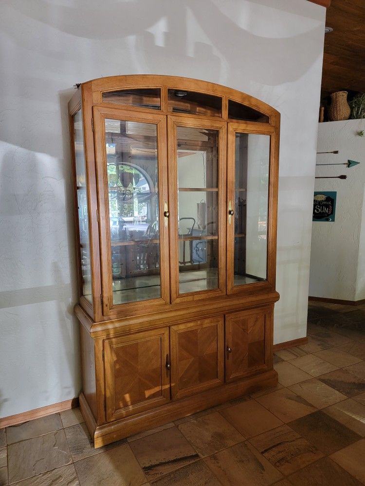 81"H x 54"W. Oak cabinet. 2 glass shelves. With interior light.
