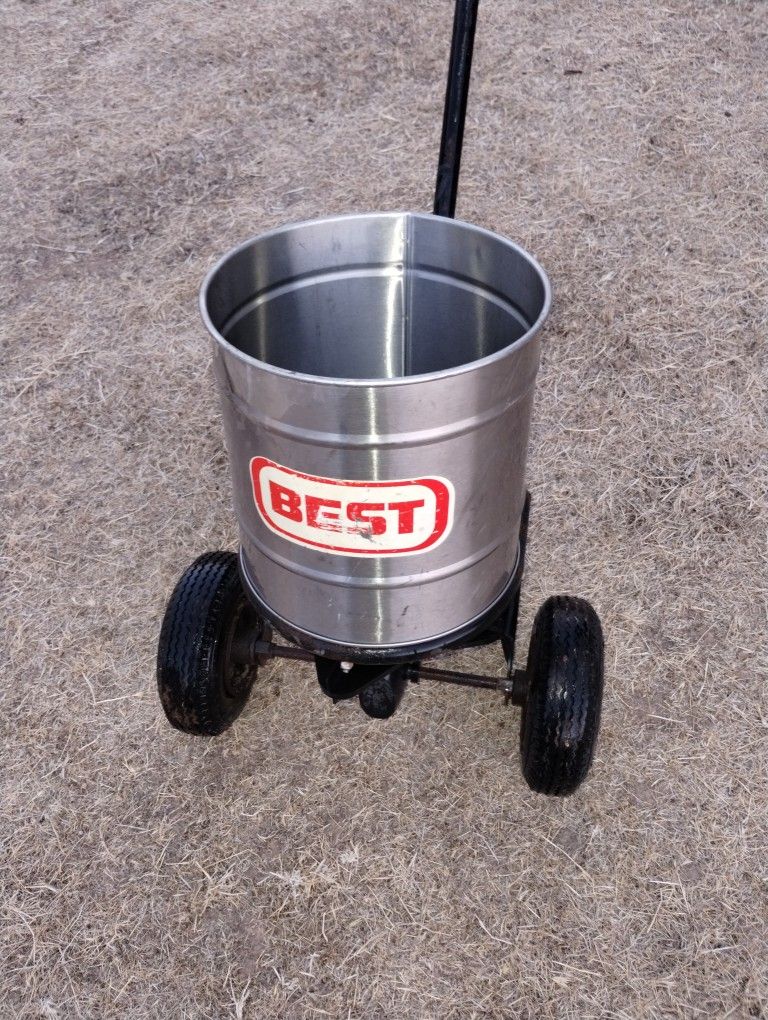 Nice, vintage metal seeder. Has a push lever on the handle to open and close to bottom to control seed flow. Works like a champ