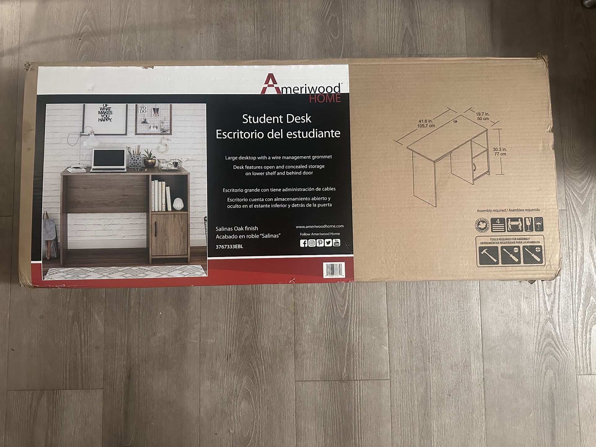 The Ameriwood Home Student Desk in Salinas Oak (model (contact info removed)EBL) is a practical, space-saving piece of furniture. Since yours is still in the box, here are the official specifications you'll need for planning your space or listing it for sale. Ameriwood Student Desk Specifications • Finish: Salinas Oak (a light-to-medium woodgrain laminate). • Primary Material: Engineered wood (MDF/particleboard). • Assembled Dimensions: Approximately 30" H x 41.6" W x 19.7" D. • Weight Capacity: • Desktop: Supports up to 50 lbs. • Side Shelves: Each shelf supports up to 15–20 lbs. • Storage Features: Includes two open side shelves, ideal for textbooks, a computer tower, or storage bins. • Assembly: Requires two adults for assembly; all hardware is typically included in the box