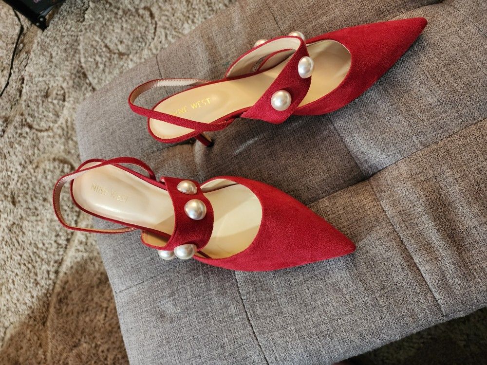Perfect shape, not worn, new without tags. Size 11 (fit like 9.5/10) Nine West red suede with pearl accents. Beautiful shoes! Only asking $20