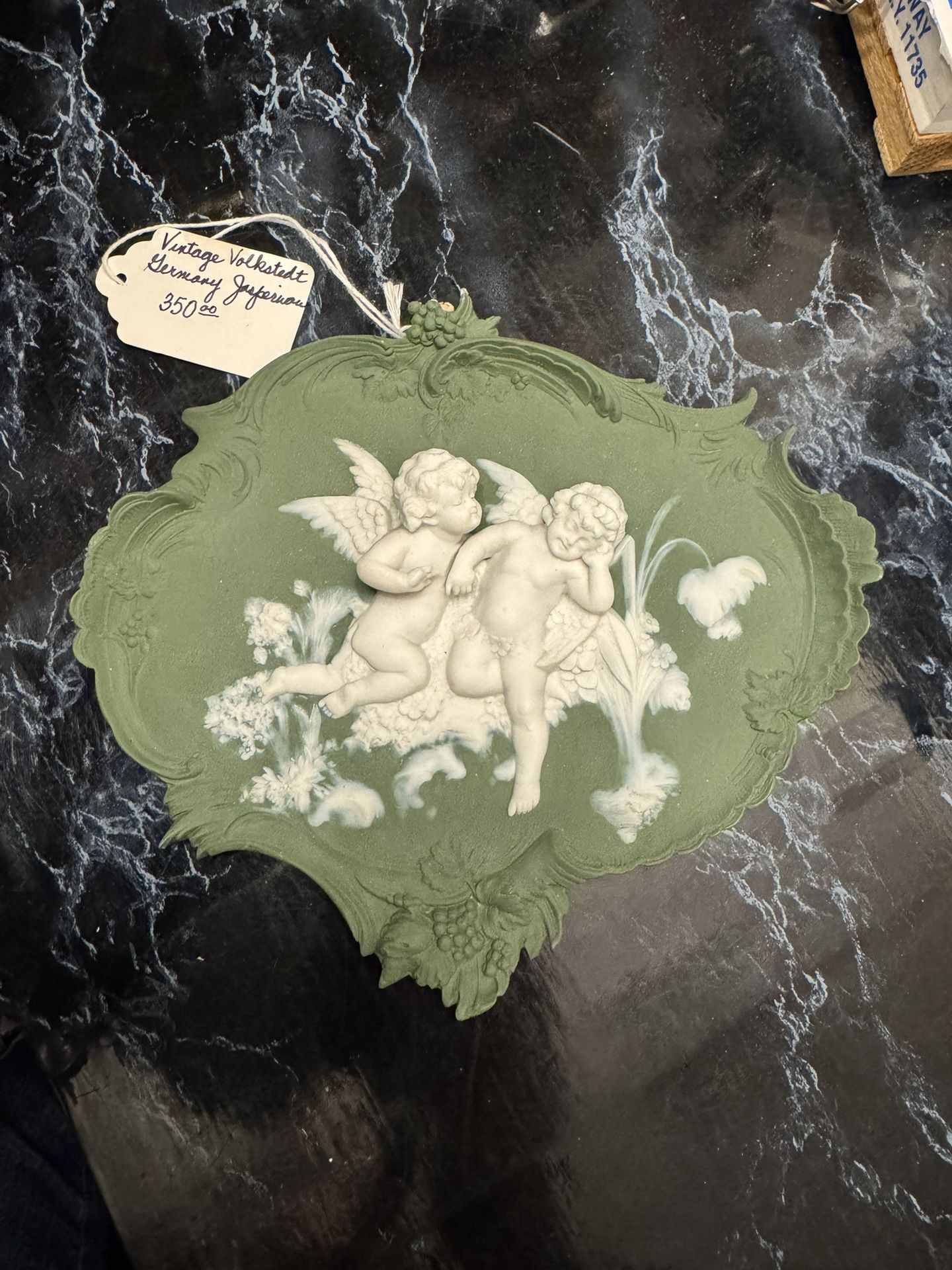 Vintage Volkstedt Germany Jasperware Relief Plaque Wall Art Decor. Early 1900s German green & white high relief plaque. Elaborate scrollwork framing an enchanting scene of cherubs. Incredibly detailed piece with makers mark & ring for wall hanging. Measures approximately 7” long x 6-½” tall x 1-¾” deep at greatest points