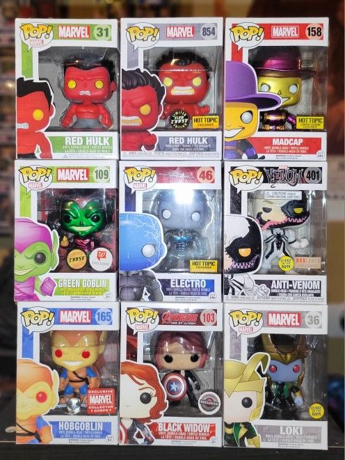 Marvel pops, pick up in Humble near IAH Red Hulk 31 (box damage) $20 Red Hulk chase sold Madcap metallic chase sold Green Goblin chase sold Electro metallic GITD (Minor box damage) $60 Anti-Venom BL Exclusive $50 Hobgoblin (box damage) $40 Black widow sold Loki frost giant GITD $40