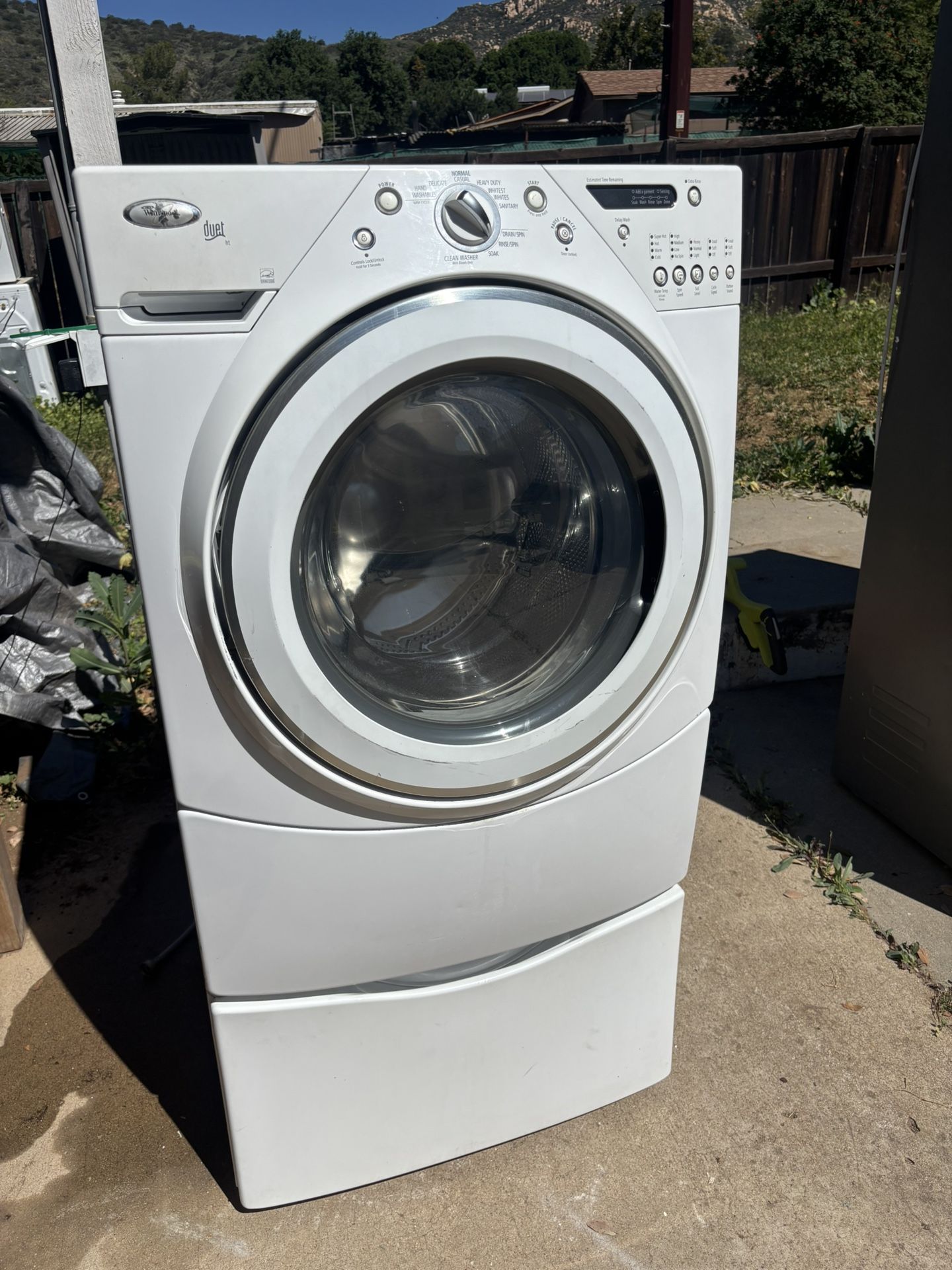 Available if the post is up. Thanks. Good condition washing machine with pedestal. Works great. Lots of cycle options. Clean and ready to use. Delivery and maintenance install available. Thanks for looking.