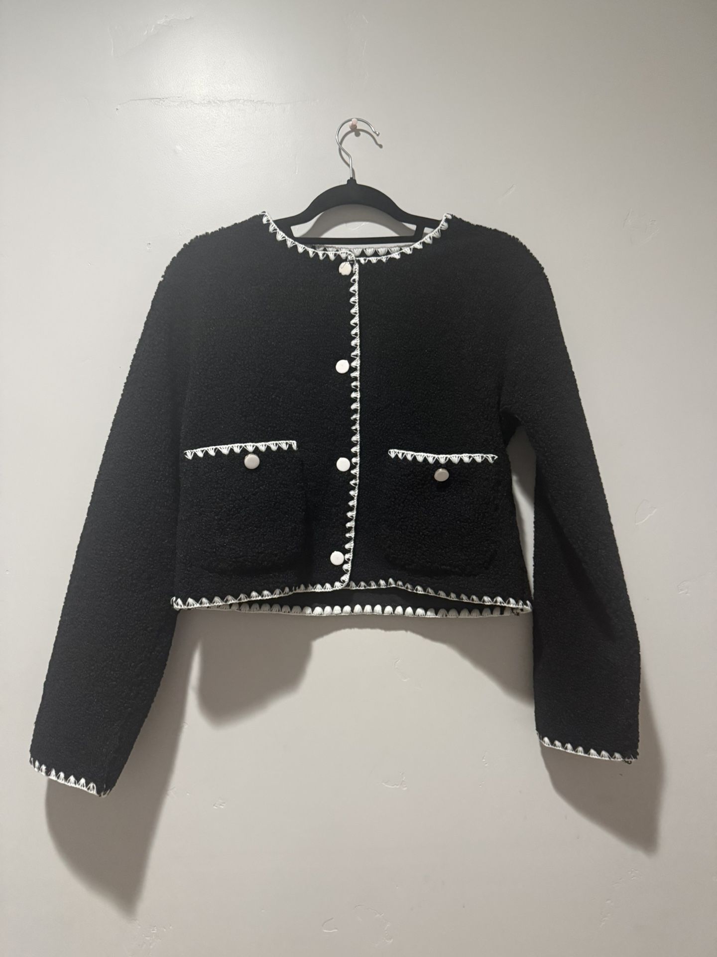 Chic black jacket with elegant white contrast trim throughout. Features a textured fabric, round neckline, long sleeves, and decorative white buttons down the front and pockets. Perfect for dressing up casual outfits or layering over dresses. Timeless, stylish, and versatile.