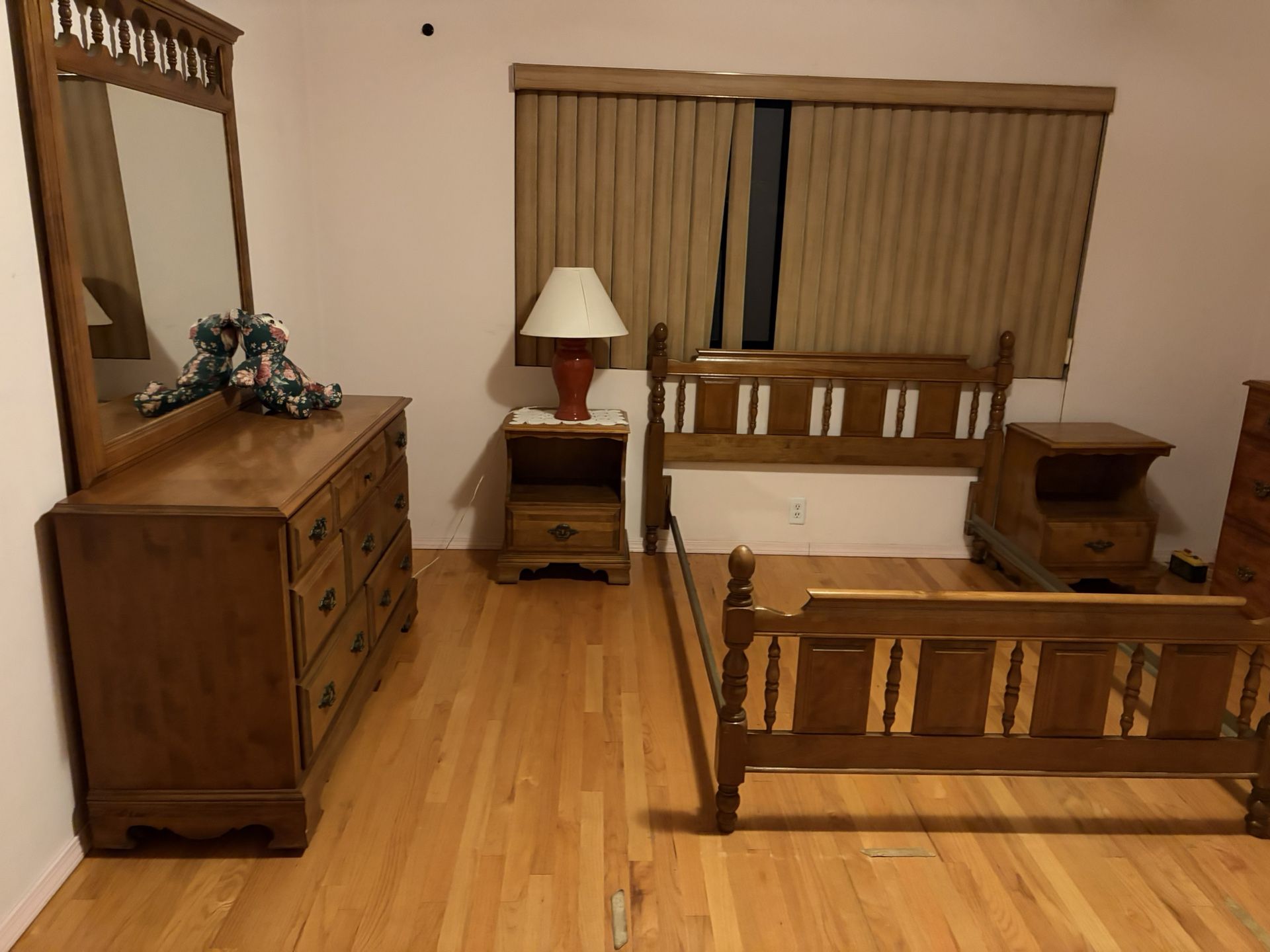 MUST GO BEFORE THUR DEC 18, 2025. Complete master bedroom wood furniture set, consisting of: Two nightstands / end tables 20" wide, 16" deep, 26" tall Tall, 6 drawer dresser 36" wide, 19" deep, 52" tall Long 8 drawer vanity with mirror 54" wide, 19" deep, 34" tall (+44" mirror) Full bed frame with headboard and posts. headboard: 61" wide, 42" tall footboard: 61" wide, 29" tall. PICKUP IN VENICE/MAR VISTA ONLY. We do not have any vehicle large enough to help deliver any of this. Cash / Venmo / CashApp / Zelle accepted. Make an offer; the more you want and the sooner you can pick it up, the better the deal!