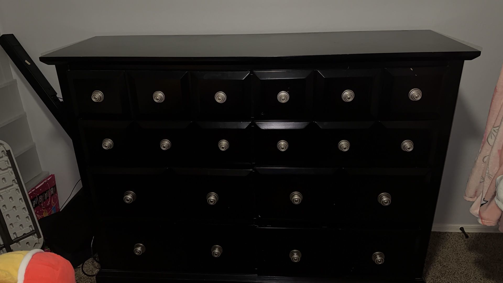 8 drawer dresser Black with silver knobs Pickup only Pretty heavy need 2-3ppl to take it downstairs from a two story house. Es bastante pesado, se necesitan de 2 a 3 personas para bajarlo desde una casa de dos pisos.