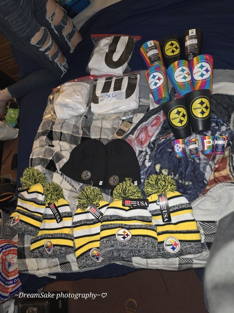 ALL STEELERS. 5 winter hats : $30 each 2 black beanies: $30 each 2 lx jersery (watts):$100 each 1 XXL jerseys (watts): $100 4 multicolor 16 oz silicone fanatics cups: $10 each or all 4: $25 4 black 16 oz silicone fanatics cups:$15 each or all 4: $35 4 multi color shot glasses: $6 each or $20 for all