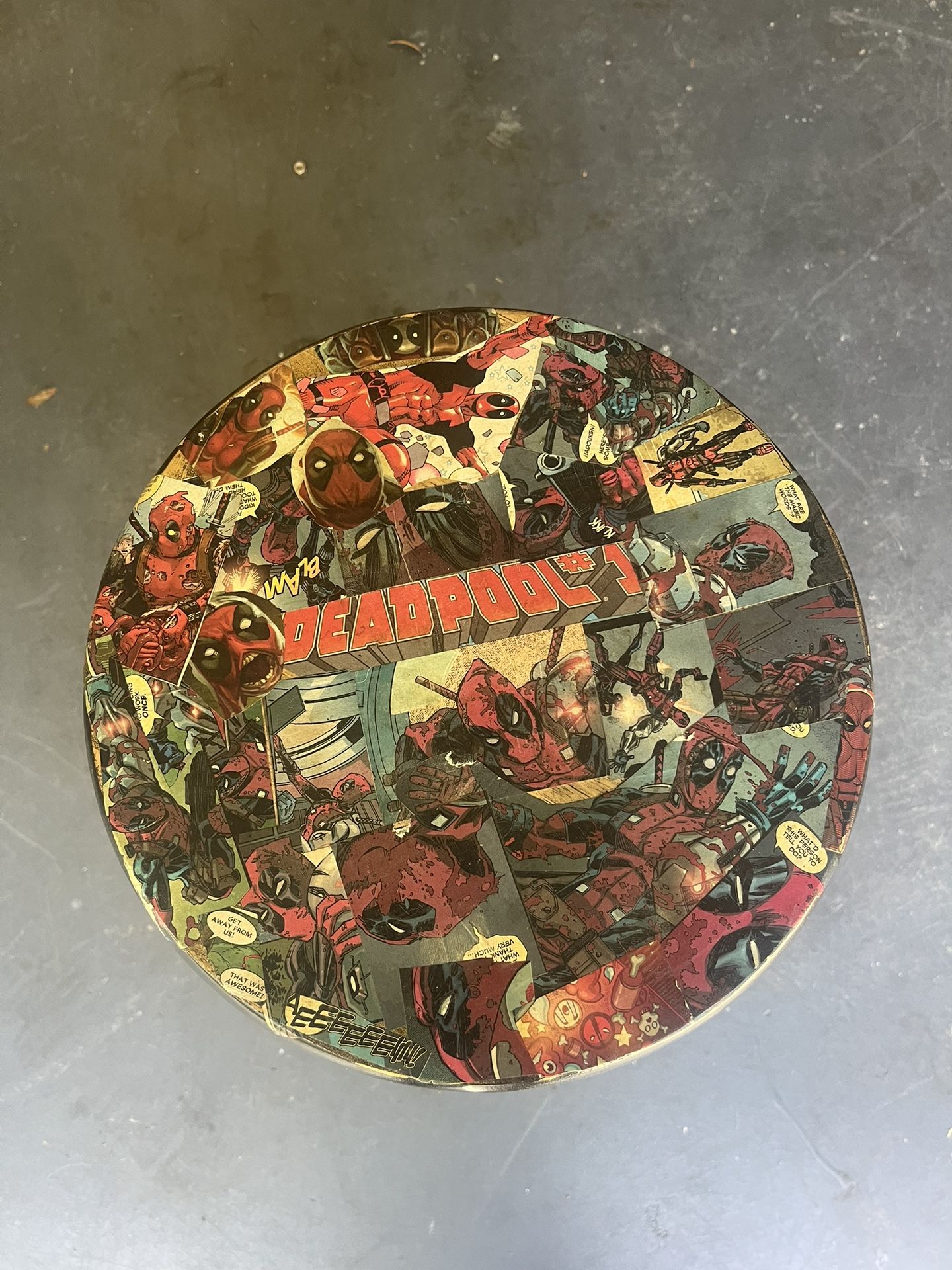 Custom handmade Deadpool themed barstool. Measurements are in the picture I made this using comic book, cut outs and sealed the top.
