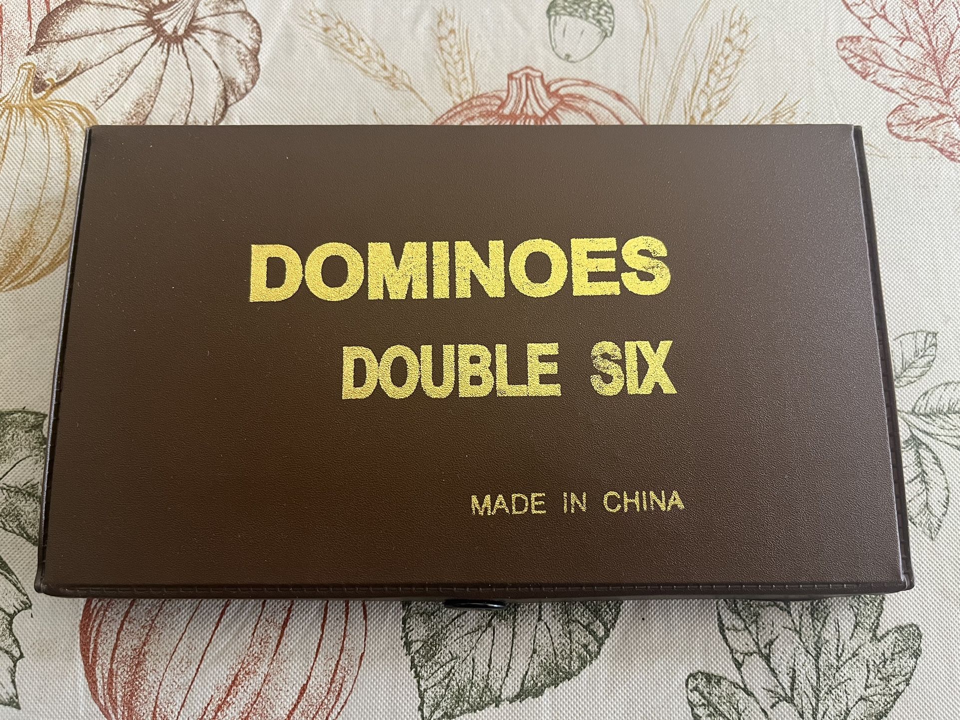 In brown case with a snap closure Red numbers White dominoes
