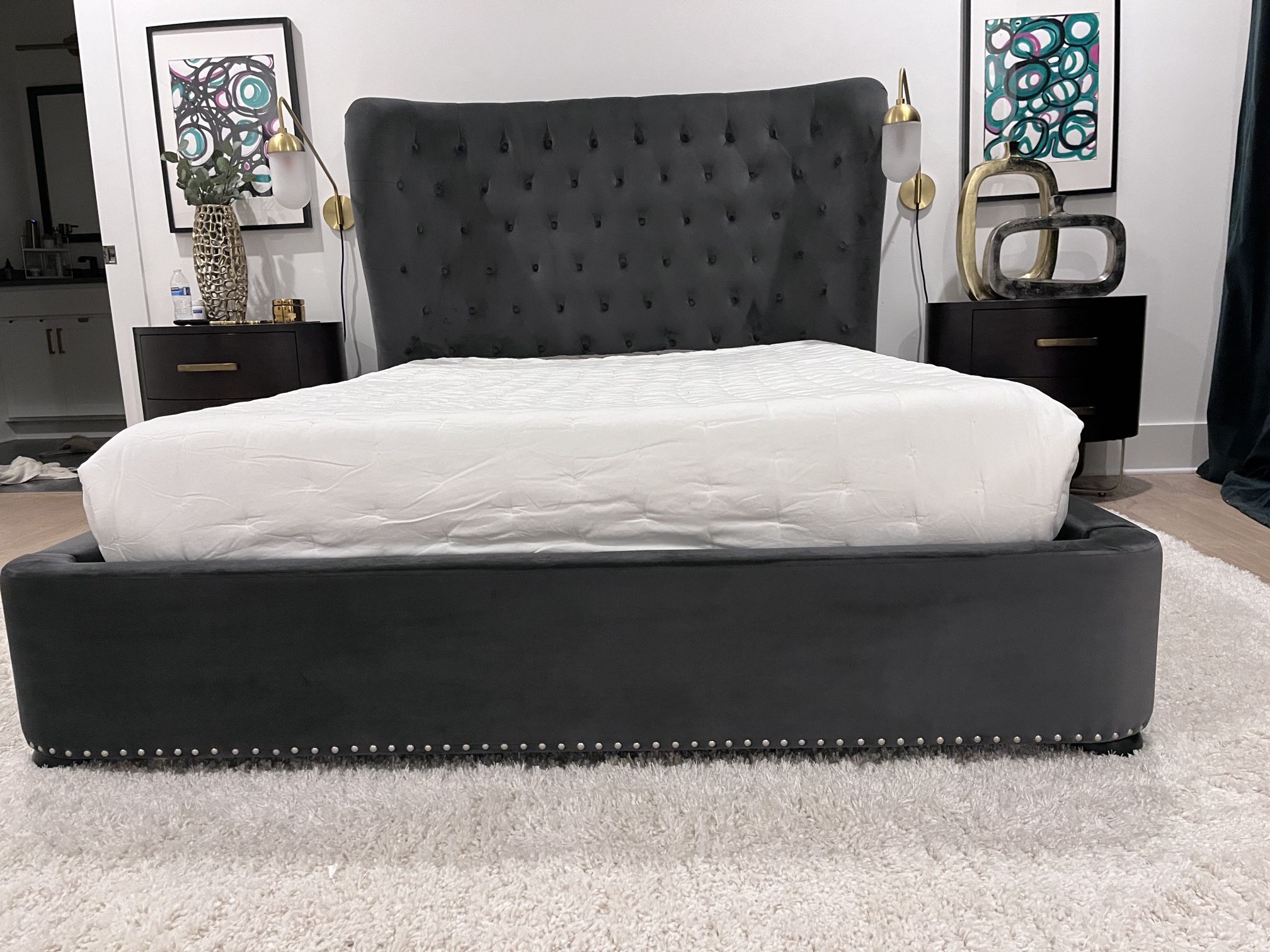 This is a beautiful, like new mid century velvet bed by Tov furniture designer. The bed is barely used and is in excellent condition. It does not require a box spring. 👋 This is the bed frame only and does NOT include the mattress or boxspring. 👋Moving assistance is NOT available.