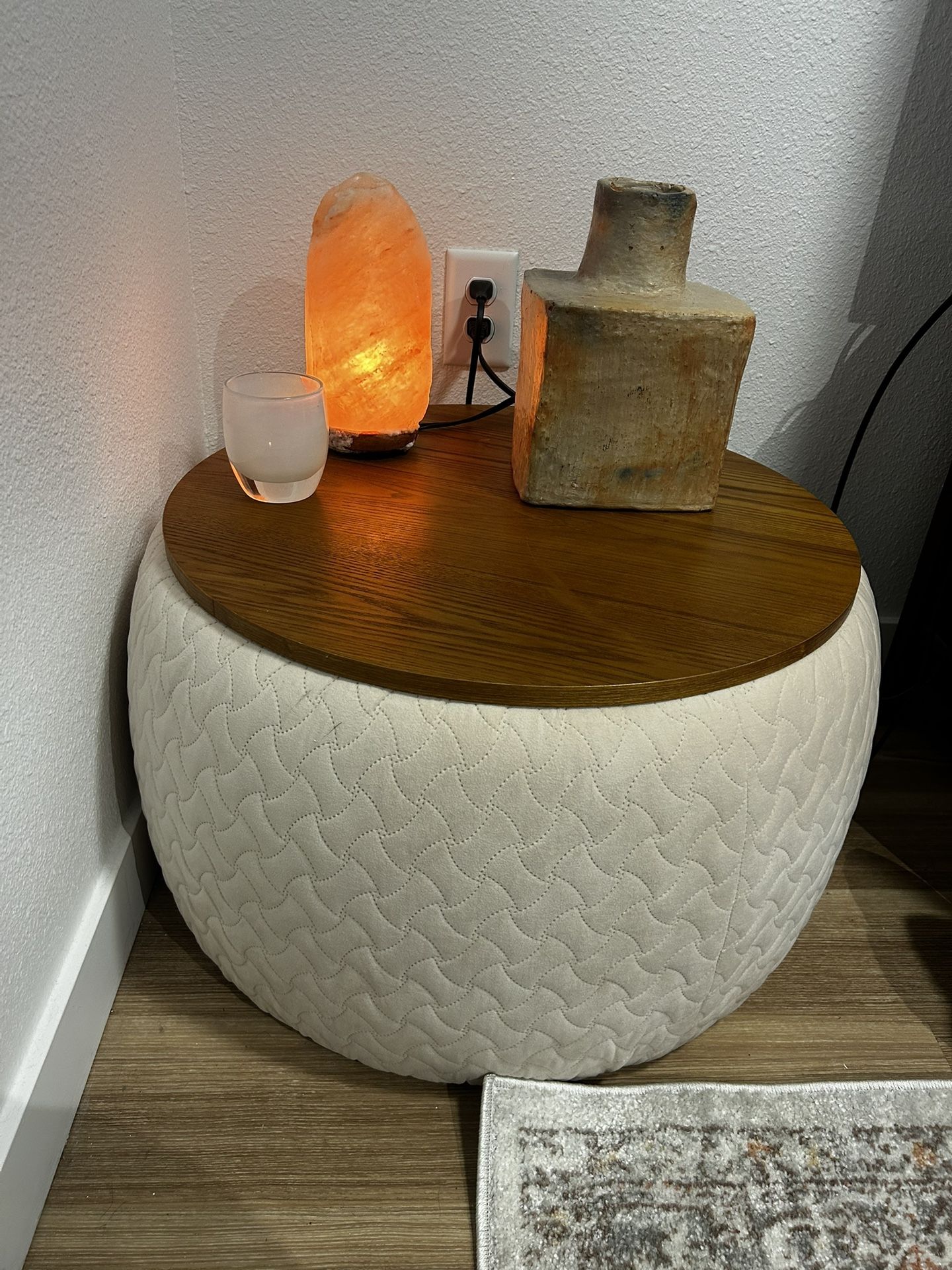 Hardwood top, fabric bottom with a lot of storage. 22inches wide, 15 inches tall. Slight demarcation on top