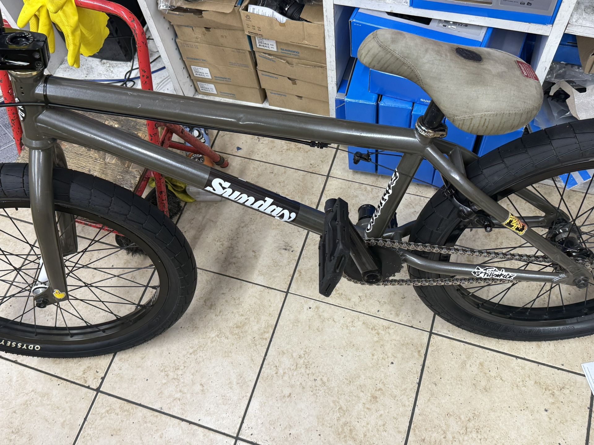 Most of the parts are ODYSSEY and PRIMO FEMALE AXLE BMX Dark Grey glossy Grips Primo Brakes ODYSSEY Seat ODYSSEY Female Back axle ODYSSEY Tires ODYSSEY Front Axle Primo Rims ODYSSEY Pedals Sunday Crank ODYSSEY Odyssey Nord Stem