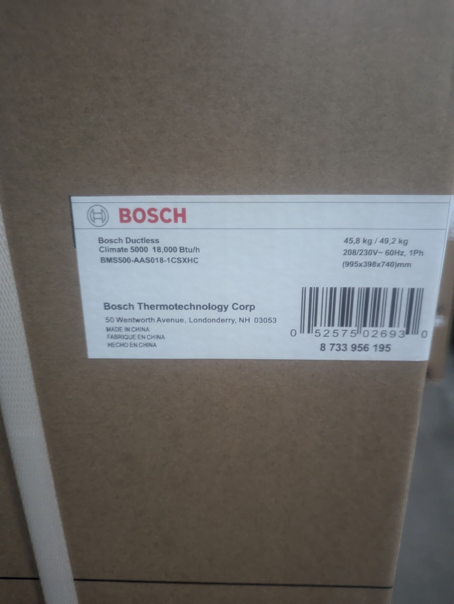 Bosch BMS500-AAM018-1CSXHC Climate 5000 Max Performance 1-1/2 Ton 22.0 Seer2 Two Zone Mini Split Heat Pump Outdoor Unit Nominal Cooling 19000 Nominal Heating 20000 Indoor Matchup 2 Electrical Designation 1-60-208/230 Refrigerant R410A SEER 22.0 EER 12.5 HSPF 9.8 Compressor Speed Inverter Suction Line Size 3/8 Suction Line Quantity 2 Liquid Line Size 1/4 Liquid Line Quantity 2 Circuit Breaker Capacity 25.0 Building Type Residential Length (inches) 17.90 Height (inches) 31.89 Width (inches) 40.55 Weight (pounds) 149.03