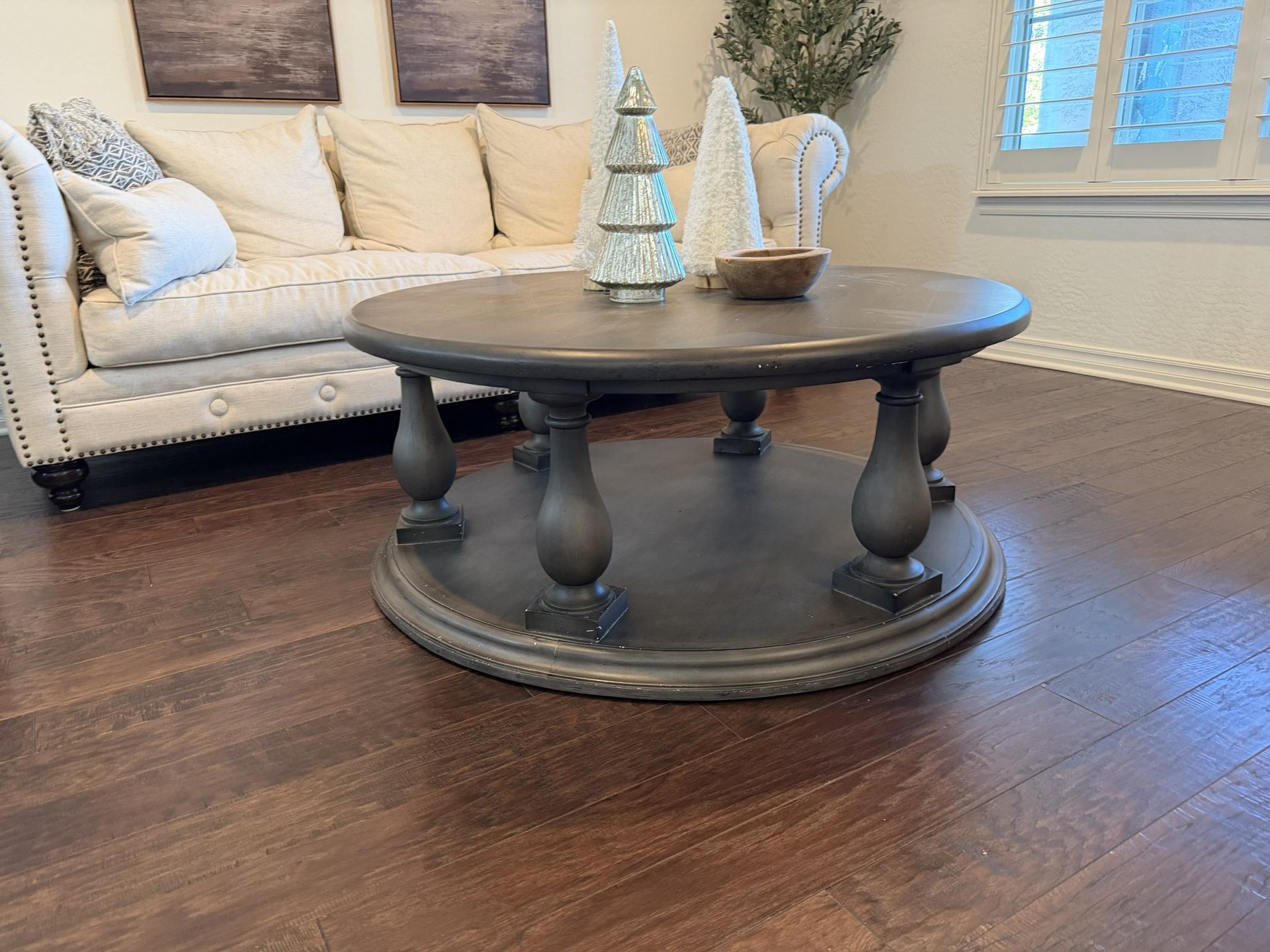 Potato Barn solid wood gray coffee table. Some paint chips must pick up. Text (contact info removed)