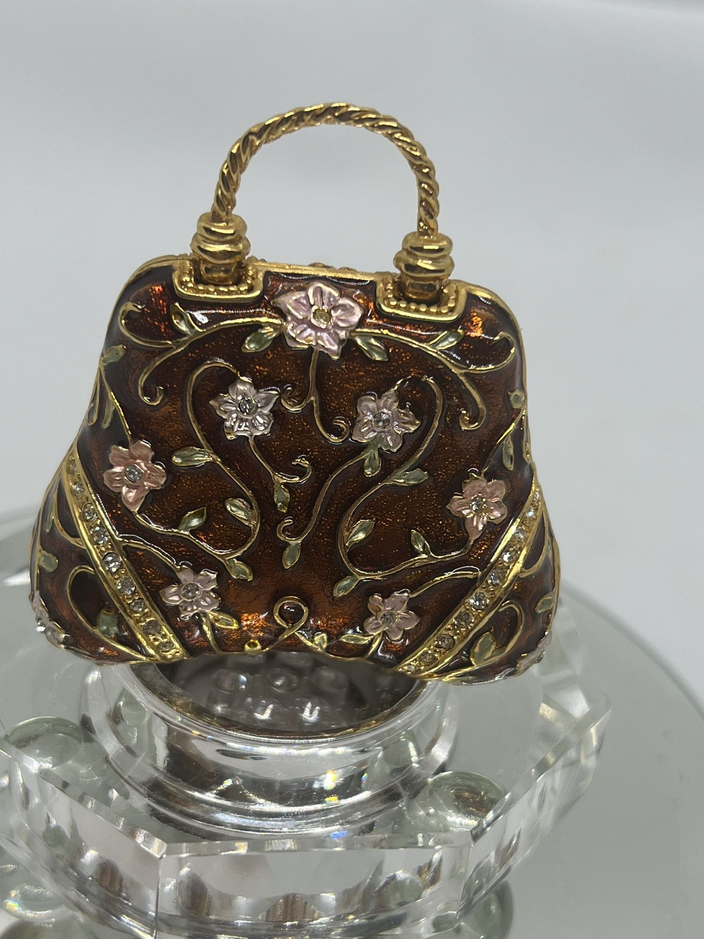 Fabrigue Purse Trinket Box - Copper Brown Enamel W Flower Rhinestone Crystals