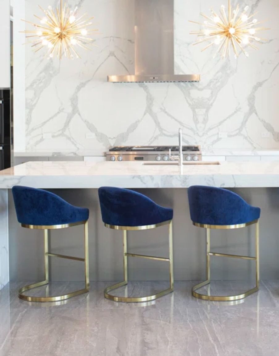 Blue velvet barstools with gold legs. Set of 3. Overall dimensions: 31" H X 26" W X 29.5" D