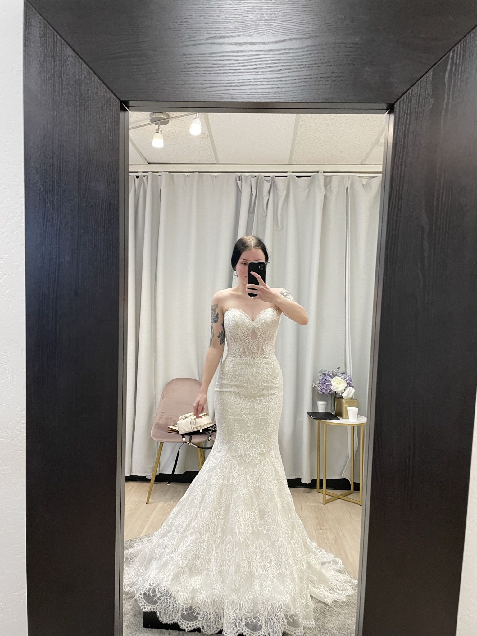 Beautiful, one of a kind, discontinued lace Madison James (MJ300) mermaid dress. Size 4 in Latte/ivory. Purchased at Brilliant Bridal in Feb 2023. There is nothing wrong with this dress, I just bought too early and ended up changing my mind. Originally paid $1900. Comes with garment bag. This is a used dress, but there are no signs of wear or damage. There were straps pinned to the dress in pics 2 & 3, and they come with it, but they are not attached/sewn on. I am 5’ 1” and was about 125lbs in this picture for reference. Pickup in Ahwatukee or I can drop off to you depending on your location for a fee. Open to offers, but I’m in no rush to sell so don’t lowball.