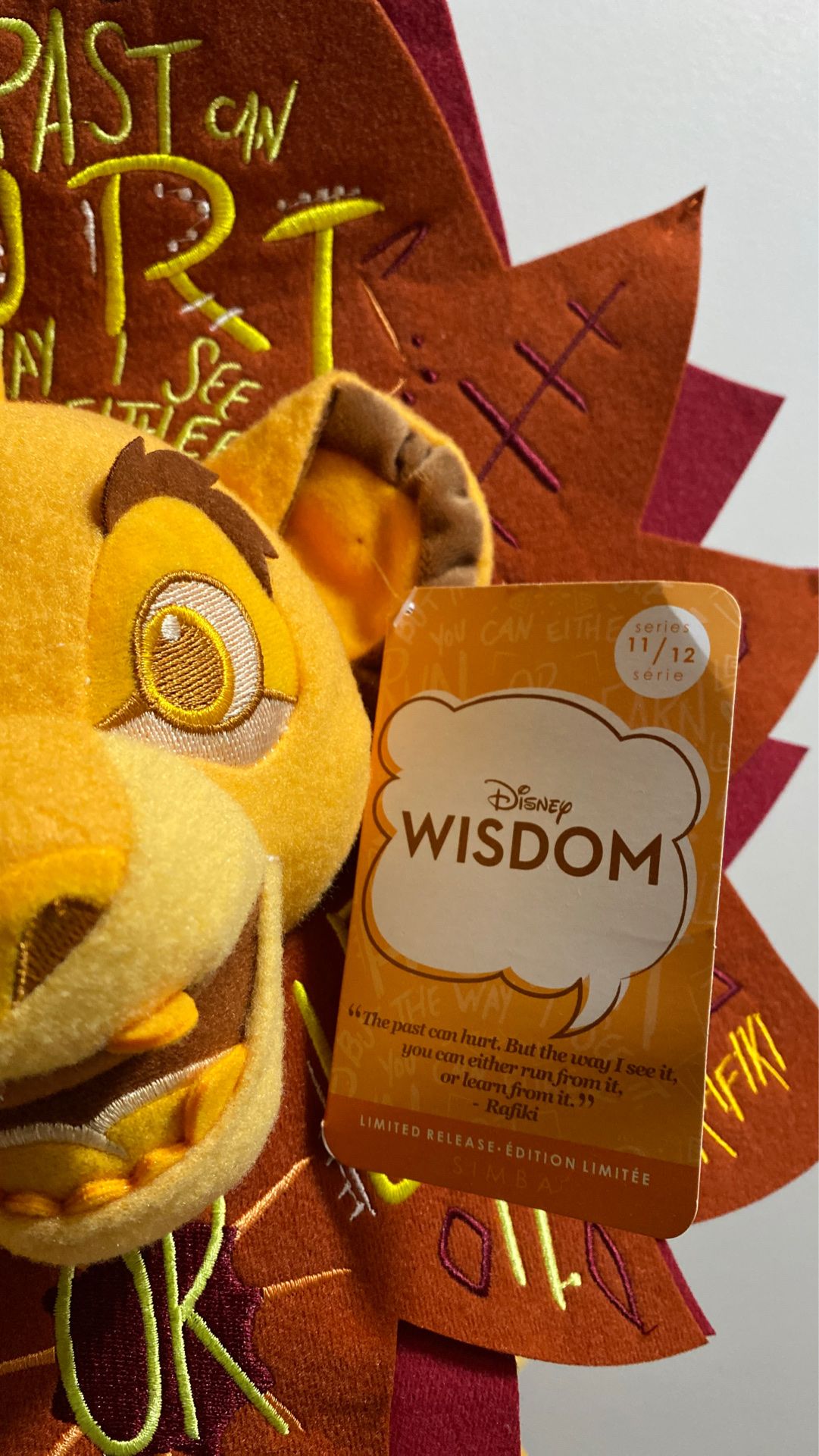 You'll be the king of beasts when taming our soft plush Simba featuring an enduring quote from Disney's animated classic The Lion King embroidered on his mane. This special edition plush from the Disney Wisdom Collection is the November selection in our monthly series. Magic in the details Detailed plush sculpting Embroidered facial features and detailing Felt mane Embroidered Rafiki quote: ''The past can hurt. But the way I see it, you can either run from it or learn from it.'' Eleventh in a series of 12 monthly collectible plush toys "Disney Wisdom Series 11 of 12'' woven patch on rear Inspired by Disney's The Lion King (1994) Part of the Disney Wisdom Collection The bare necessities Polyester 16'' H (including mane) Imported