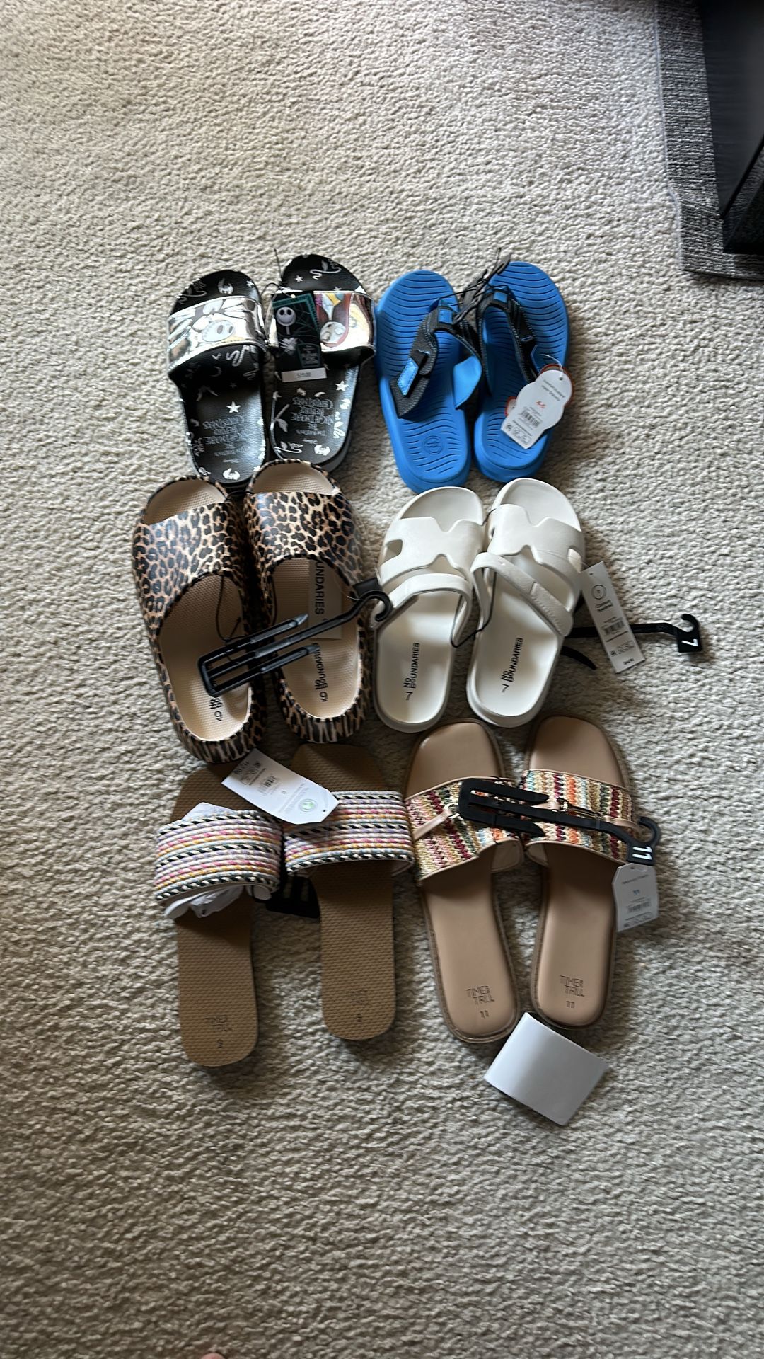 Summertime sandals and flip flops,from left top to right bottom items number from 1 to 6. When identifying it. We different sizes and styles (item is $5each.