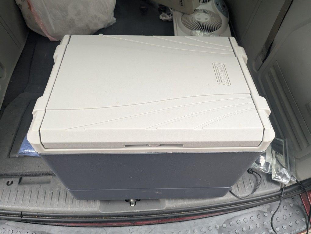 On your next road trip, chill drinks and food up to 40 degrees cooler than the surrounding temperature without the need for ice with the Coleman® PowerChill™ Thermoelectric Iceless Cooler. The lightweight travel design makes it easy to move to and from your car or trunk. With a 12-volt plug and 8-foot power cord, you can easily power this cooler on the go using a car or boat outlet. • Cools without ice to stay up to 40 °F colder than surrounding temperature • Perfect for long road trips in truck cabs, the family car, and RVs • 40-qt. (1.3 cu. ft.) capacity, holds 44 cans • 12V plug (5 Amps/60 Watts) with an 8-ft. power cord lets you power the pump from your car or boat outlet *** AC adapter included! *** • Storage tray keeps your contents organized • Use as a chest or upright cooler • Door converts to open from right or left side • Lightweight travel design - 18 lbs. to easily move to and from your car or truck • External dimensions: 23.5 x 15.3 x 17 in