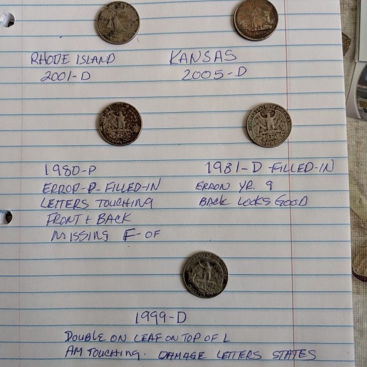 Have these five quarters look pretty interesting? Most have errors. Fill in mint marks letters, touching some doubling. $80. OBO Salinas California