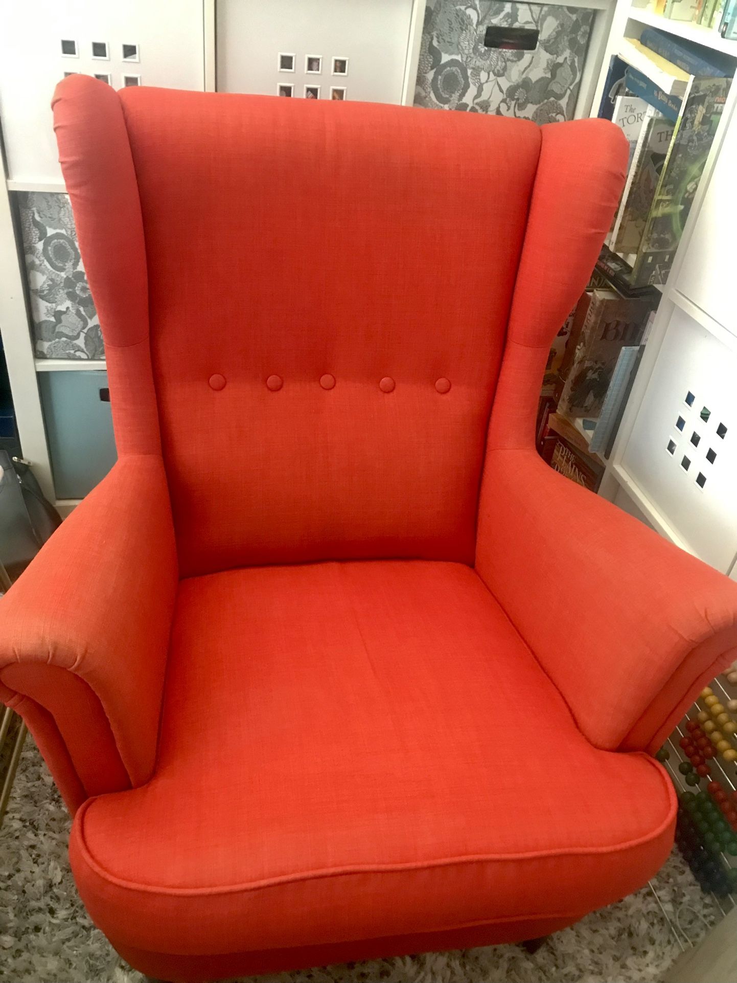 MUST GO TODAY MAKE ME AN OFFER IF THE POST IS STILL UP IT IS STILL AVAILABLE! Beautiful Red/ Rusty colour Vintage colour no longer sold in stores. Excellent statement piece :) definitely eye catching. Would look Beautiful in an office or living room or bedroom. Very versatile. It’s in good condition but definitely well Loved. Slight discolouration on arm rests on the chair due to normal use. Some slight marks on the ottoman again from normal wear and tear. But structural in great condition. Smoke free, pet free home, and one tiny human. It’s ready for a new home :) Cushion cover comes off and can be washed (I just did last week) have vacuumed and spot cleaned it as well. Potential delivery with addition gas/time fee. Pick up near 24th street and southern.