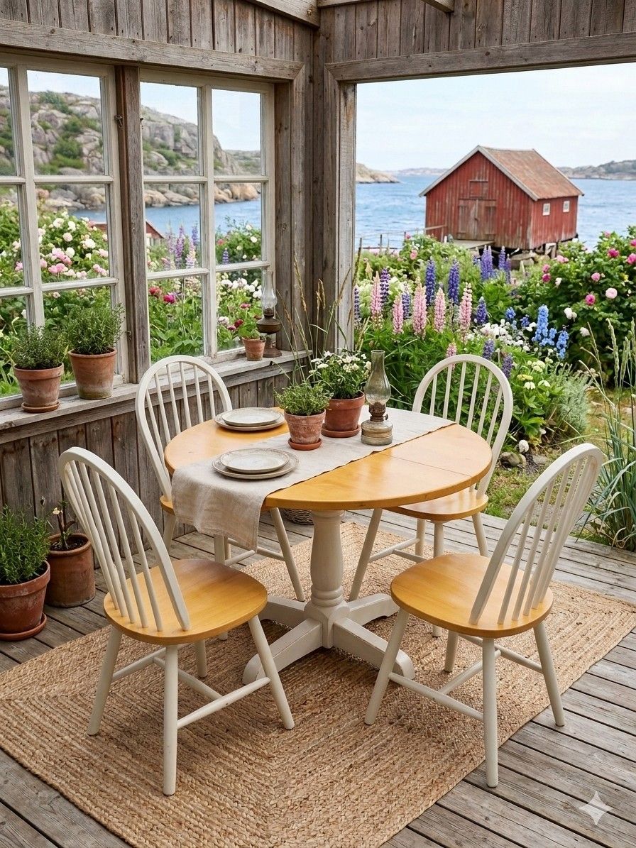 Set Of 4 Classic Wood Chairs And Table Windsor Spindle Back Cottage Farmhouse Cabin Cottage Scandinavian The Archipelago Sunday The air in the Bohuslän coast doesn't just move; it carries the scent of salt, wild lupines, and a century of quiet resilience. You’ve spent the morning watching the tide retreat from the red granite rocks, and now, the light is doing that specific golden thing it only does in the North. It’s time for coffee. Not the rushed, paper-cup variety, but the kind that requires a heavy ceramic mug and a seat that understands the value of a slow afternoon. Our Scandi-Coastal Dining Set is that seat. The table—a sun-drenched pedestal of honey-toned wood—is sturdy enough for a mid-sommer feast of pickled herring and new potatoes, yet intimate enough for a game of cards while the wind rattles the cottage glass. It’s paired with four Windsor-style chairs, their arched backs and elegant spindles providing a silhouette that is as airy as the sea breeze and as timeless as a wooden koster boat. White-washed legs for that clean, maritime look. Warm wood seats for a touch of rustic soul. It’s a piece of the Swedish summer, even if your "coast" is just a rainy afternoon in the city. The Details: The Set: One round pedestal table with four coordinating Windsor-arch spindle chairs done in Scandinavian rustic style. The Vibe: High-latitude charm. Pairs well with linen runners, kerosene lamps, and the complete absence of a cell signal. The Condition: Refined but lived-in. Ready for its next chapter in your personal retreat. Add a touch of timeless classic character to your home with this set of four classic wood chairs and matching table. These are solid, well-made, and incredibly sturdy pieces that bring both function and a sense of history to any room. Probably oak but I'm not sure. Design: Traditional Windsor-style spindle backs with a charming two-tone finish (natural wood seats paired with white frames). These are in good used condition. While they aren't cosmetically perfect, they are very much presentable and perfectly usable as-is. Please note, while all 4 are close to identical, one is a little different, barely noticeable. Pretty similar though. Total Back Height: Approximately 37.5 inches. Seat Height: Approximately 17.5 inches. Seat Width: Approximately 17.5 inches. Table Height: 30 in. Table Width: 42 in. Seperate sales available. Table: $75 4 Chairs: $125 2 Chairs: $75 Versatility: Their simple but classic profile allows them to fit into almost any decor style. Beyond the dining room, they work beautifully as side chairs placed side-by-side in a hallway, entryway, or living area to create a cozy, symmetrical vignette. Maximalist: Use them as a grounded base for colorful cushions and bold surroundings. Minimalist: Let the clean white lines and natural wood stand out in a simple space. Traditional: They perfectly complement a classic farmhouse or cottage vibe. Note on Photos: Please note that the staged indoor photos provided are AI-generated to show how the chairs can look in a contemporary home setting. Please refer to the actual photos (outdoors on gravel) to see their true current appearance and condition. Location: Available for pickup in Northeast Seattle. Delivery: I may be able to provide delivery around the Seattle area for free or a reasonable charge depending on your location. vintage chairs windsor style spindle back wooden dining chairs set of 4 farmhouse decor cottagecore furniture 1990s vintage kitchen chairs two tone furniture white and natural wood seattle furniture for sale sturdy wood seating entryway side chairs minimalist home decor mcm style traditional furniture wooden spindle chairs spindle back side chairs rustic seating dining room update