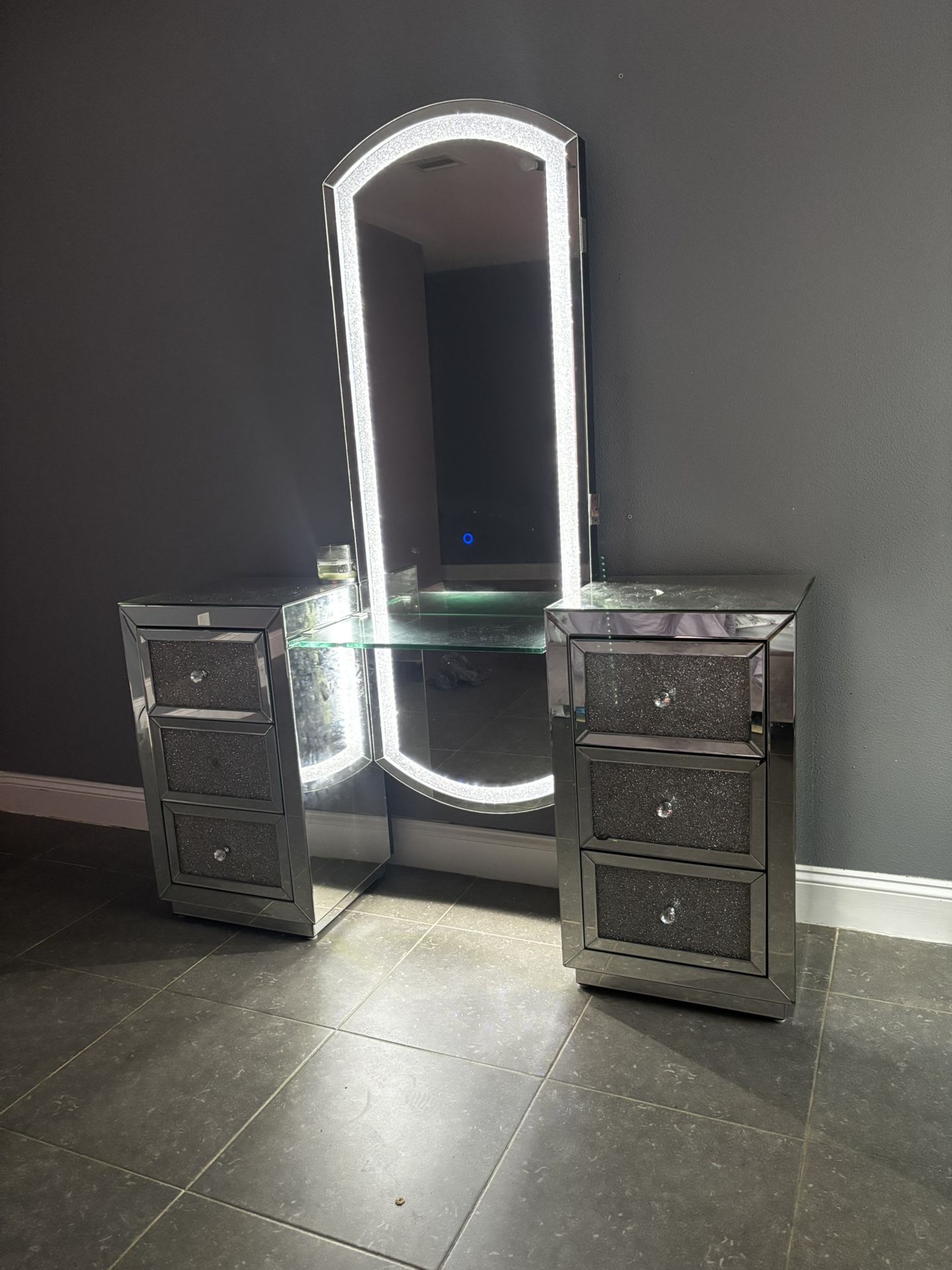 Mirror vanity with light. This vanity is so beautiful. Some pieces are missing and right top glass is cracked but can be replaced easily. Very heavy and you must pick up. I cannot help with moving it.