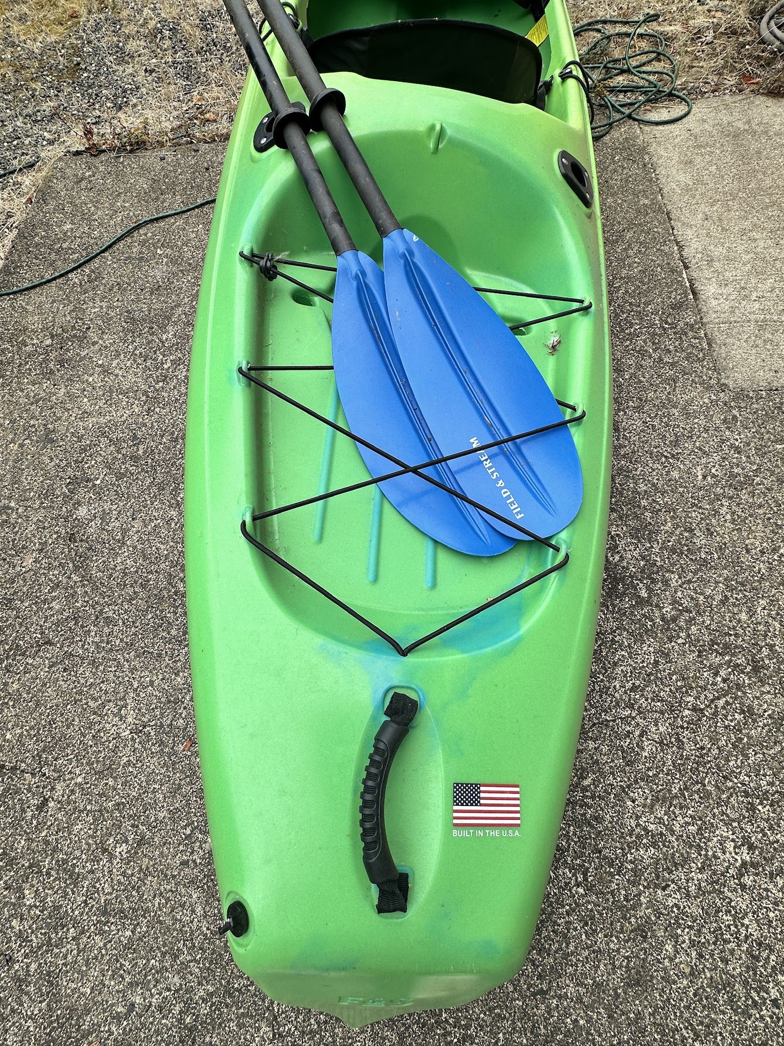 Used 3x at most. She’s a little dusty but otherwise pristine. Originally purchased for $650 brand new. Details from manufacturer: The Field & Stream® Blade 120 Elite Kayak was built for the fisherman who seeks comfort and convenience. This kayak accommodates a full day of fishing—featuring a comfort back seat, rod holders, a built-in mesh bag for storage, an open rear well for a 5-gallon bucket and more. FEATURES: Comfort padded back seat for support and all-day comfort Knee pads to ensure care-free comfort on long paddles Front and rear carry handles for easy carrying 6-inch storage hatch for on-the-move dry storage Water resistant mesh bag inside cockpit for keeping small items safe Two flat oval shaped action camera mounts on front of deck Front dashboard to temporarily place and store items Flush mount rod holders for hands-free fishing and ease Bungee cords on top of deck to ensure your gear stays in one place Beverage holders for all-day hydration and convenience Adjustable footrests to ensure lower body comfort Dual paddle keepers to always have your paddles secure Open rear well which accommodates up to a 5-gallon bucket, as well as dry bags Scupper holes and drain plug for convenient water removal For top-of-car transportation we recommend straps with buckles Built in the USA Country of Origin : United States of America