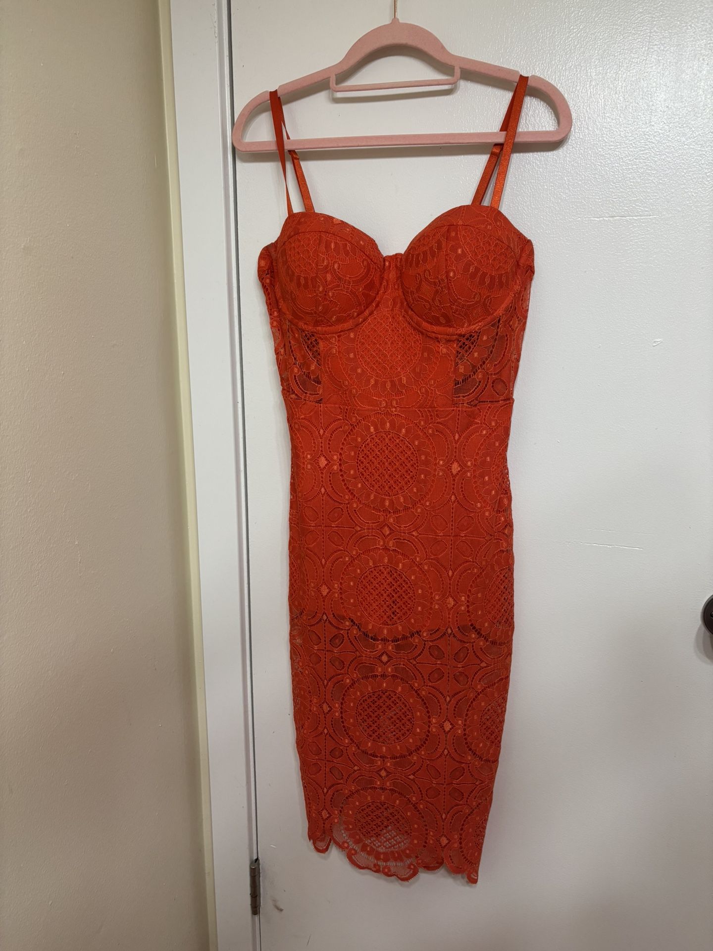 Red/Orange Lace Bustier Style Top/Sheer Lace Bottom Retro Style Wiggle Dress, Size 8