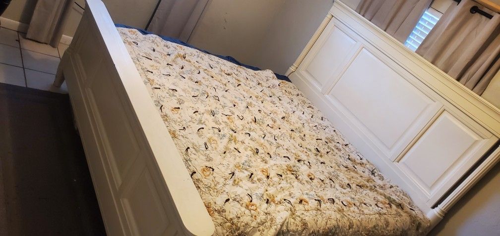 Solid king size farmhouse bed frame solid wood construction for $650. Have a memory foam 10in mattress with flat top box springs for an extra $200. Also have matching end tables for an additional $300 if interested. Set was over $4000 from Rooms to Go. Mattress is less than 5 years old.