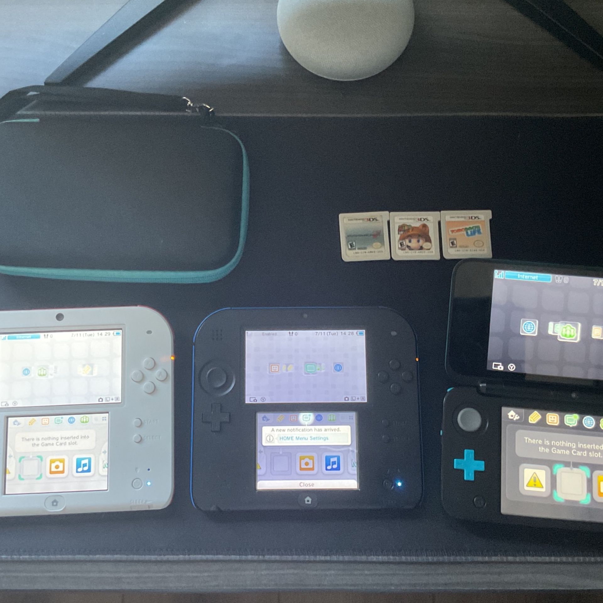 A 2ds xl and 2 2ds in really great condition It comes with 3 games Super Mario 3d land Mario Kart 7 Tomodachi Life It will also come with a carrying bag for the 2ds xl and a charger Price is firm I can also do trades for ps5 Xbox series X Xbox series s bundle Nintendo switch oled bundle Vr bundle However you can also offer trades to see if I’m up for it And I also can’t deliver, we would have to meet up somewhere close to me Also selling together, not individually