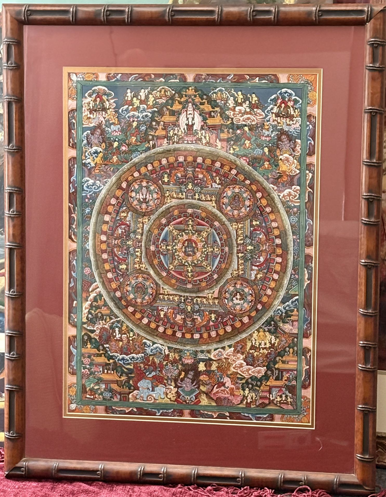 I'm selling a Beautifully and Professionally Framed Tibetan Buddhist Thangka Oil Painting featuring a Mandala of a Bhavachakra/Samsara wheel. It measures 29.5" tall x 23" long x 1" wide. The art itself measures about 21" tall x 15.25" wide. The frame is moulded / shaped to have a bamboo look to it. Excellent condition. Really the only flaw has is one very small tear on the back paper.