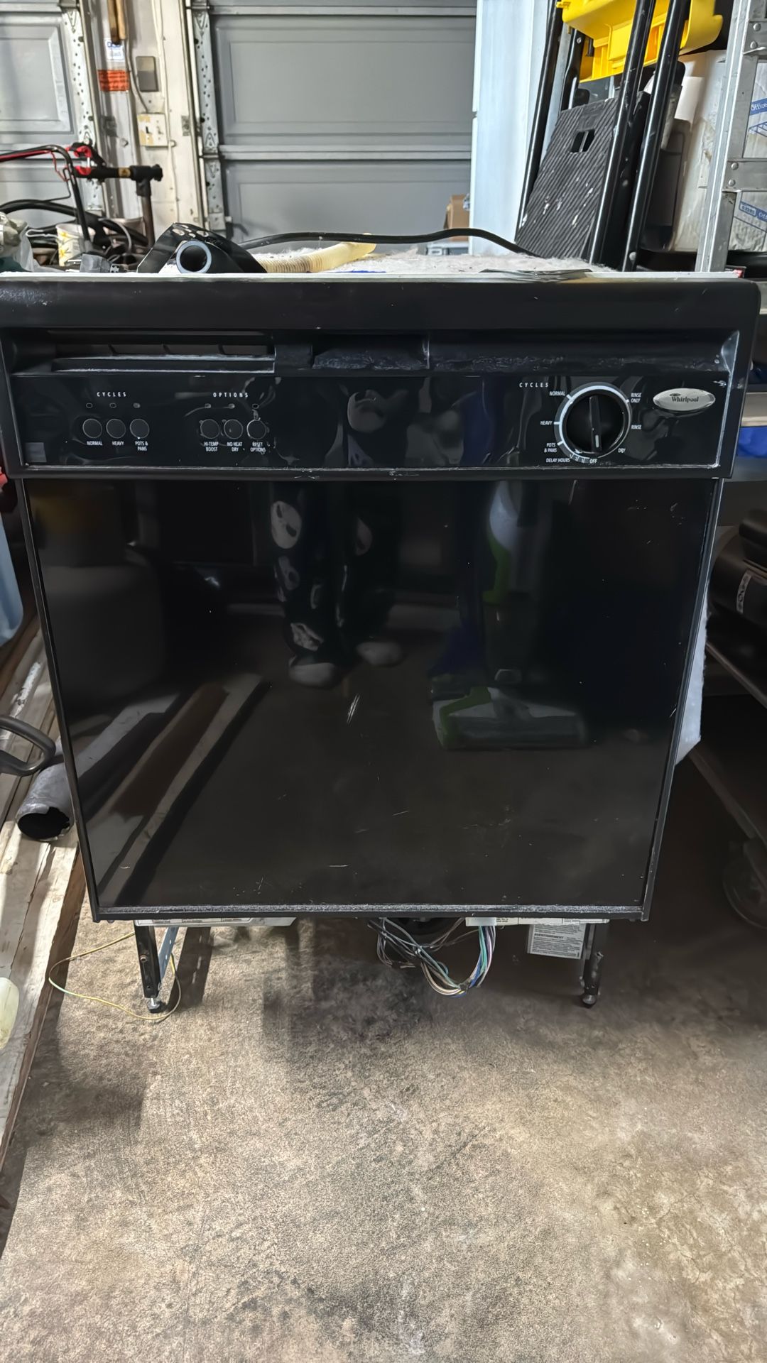 WHIRLPOOL DISHWASHER BLACK WITH CONTROL KNOBS, 24 INCH UNDER COUNTER MOUNT, ALWAYS STORED INSIDE AND PRICED TO SELL.