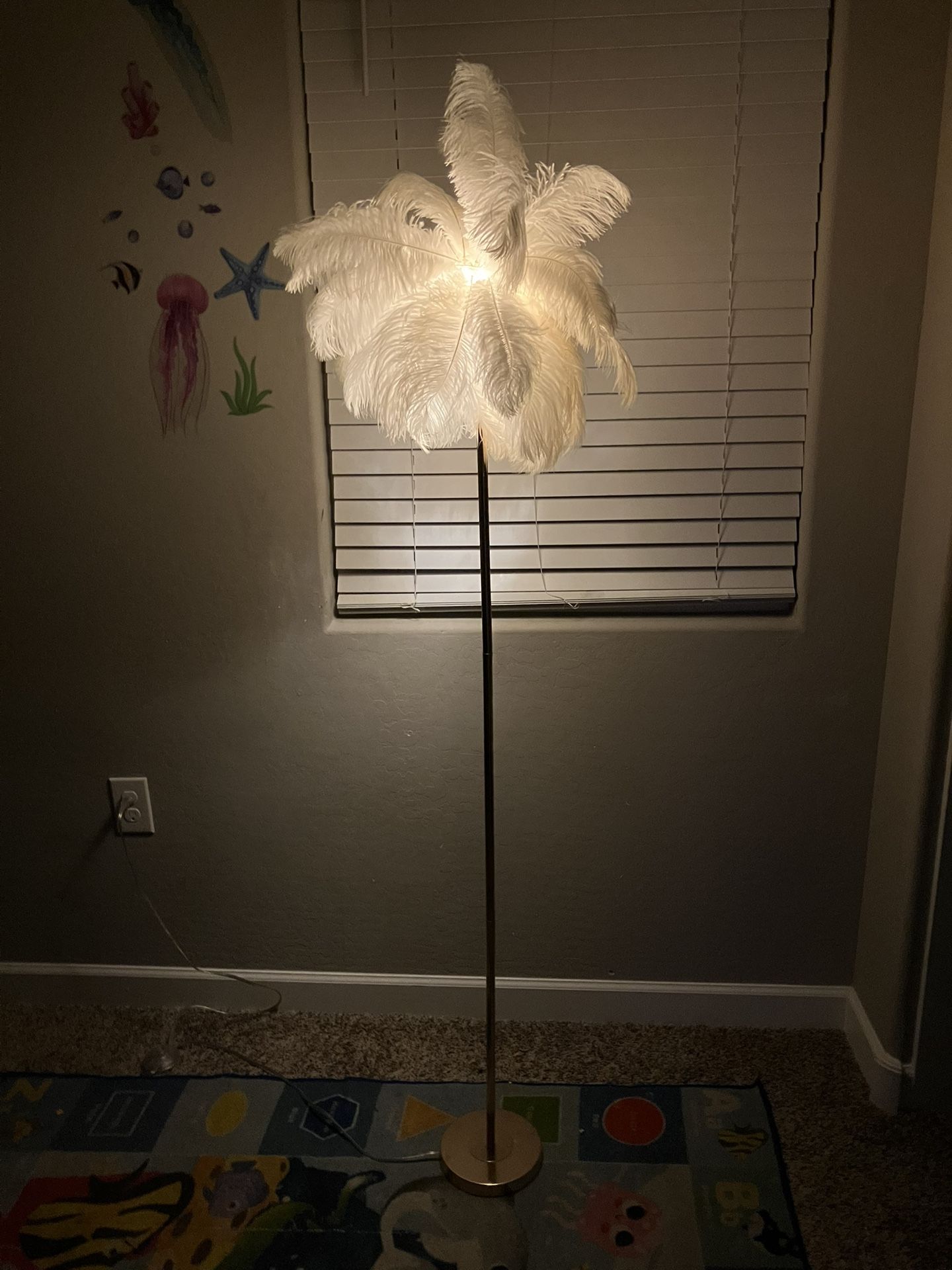 Feather Floor Lamp Works great normal wear Plug in with button to turn on and off White ostrich like feathers and gold bottom Uses g43 bulbs comes with three Retails for over $100 Can deliver for a fee or pickup in Laveen! Thank you!