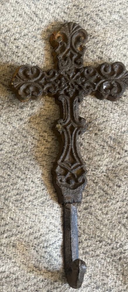 Rustic Cross Hook farmhouse wall decor. See pictures for details and description. Designed with a hook to hang items. Heavy. Mounting Hardware not included.