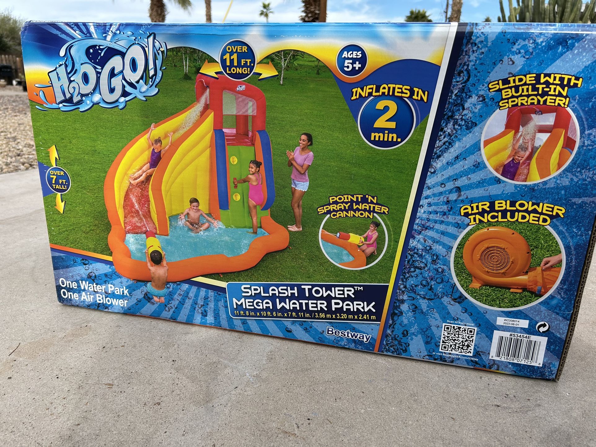 H2O Go! Splash Tower Mega Water Park. Still in box, never been opened! Includes water cannon, air blower ( blows up in 2 minutes). Specs:11’8” X 10’6” =length X width, 7’11” =height. Fun for kids 4 yrs and up!