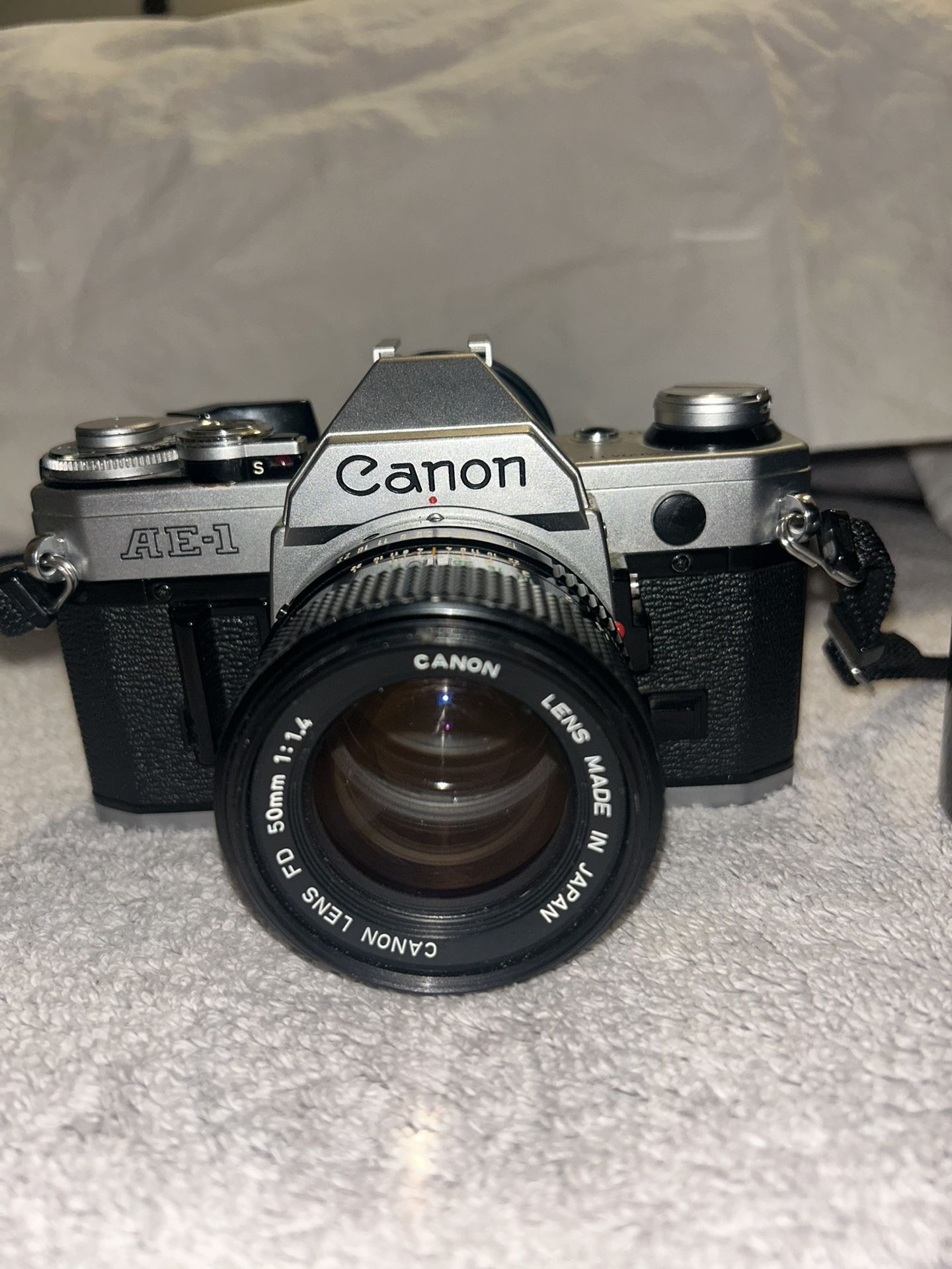 Canon AE-1 film camera for sale, featuring a 50mm lens and an additional 70-150mm lens. Both lenses are in excellent condition, and the camera is fully functional. Perfect for film photography enthusiasts or collectors. Contact for pricing or further details.