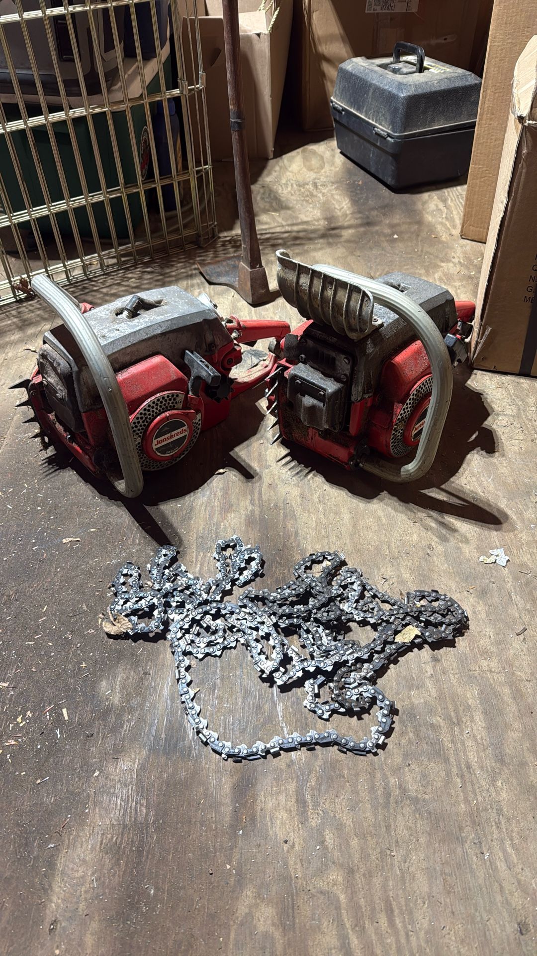 Model 621. I have two of them. One runs excellent. The other is for parts. It needs a top and rebuild. The piston and ring is worn. It doesn’t have good compression. It won’t run the other one runs like a bear. I have a few chains to go with them, but I do not have. I’m not going to sell either of the bars that I had because they fit another one. I have that I still use so basically what you see is what you get one runs mint. The other needs a top and rebuild or it’s for parts for this one because they’re both identical 621s. I will take $145 for the pair. I don’t really wanna park them out separate. I don’t wanna sell them separately because the one that needs the rebuild is gonna be difficult to get rid of or is the other one will be easy I like them both to go to the same home.