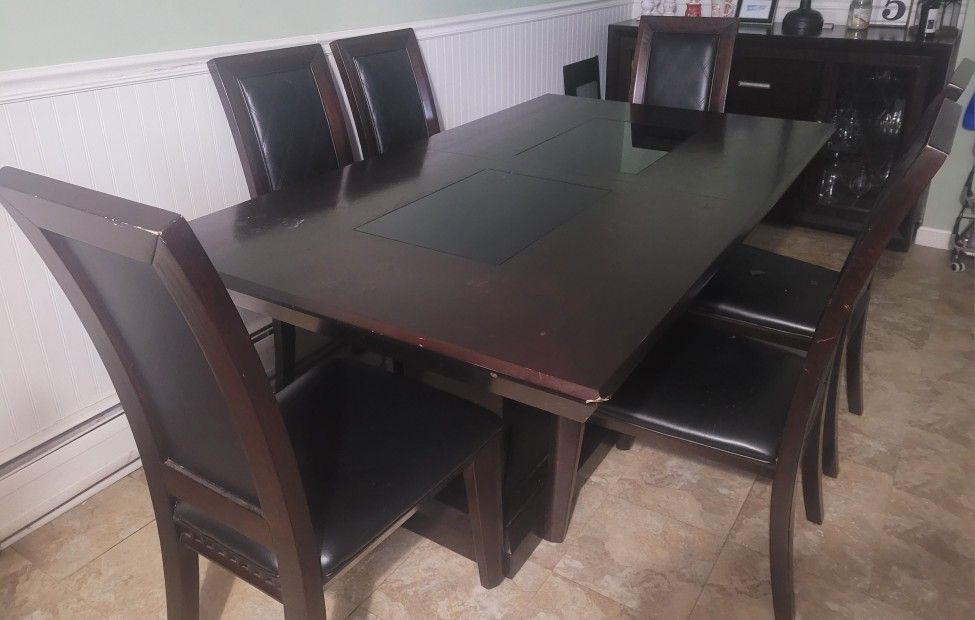 I've had this table and Buffet for about 6 years. The table definitely has its wear and tear, as you may see in the pictures. The Buffet is in really good condition aside from the small light blotch on top. Has lights inside each cabinet. The chairs are not in great condition which is why I wasn't selling with the table but if you'd like to take them even better. The table also comes with the extender(not pictured) $250 or best offer. Can buy the table separately from the buffet and vice versa. If buying separately $100 for each.