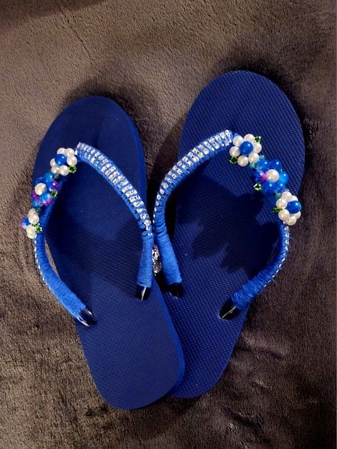 YOUR FEET DESERVE THE BEST. IAND-DECORATED SANDALS. SIZE 7 BLUE COLOR WITH WHITE AND BLUE PEARLS SILVER RIBBON #FLIPFLOPS #SANDALS #HANDECORATED #BEACHWEAR