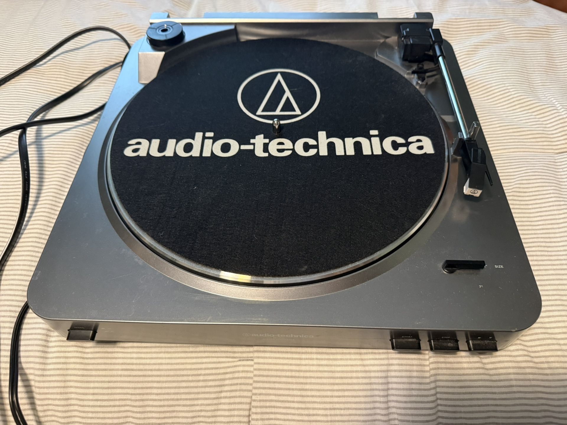 Audio Technica LP- 60 turntable. Used and works well. This is the LP-60 model and a great entry level turntable. The cartridge has been replaced recently and has probably 5 hrs of play time on it. The dust cover has scratches and is not as clear as it used to be but lifts and closes and has no other issues. The dust cover is removable. Asking for cash only. Thanks