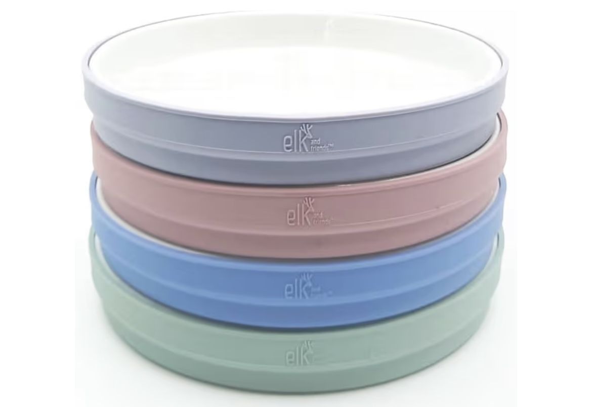 Elk and friends 7.8 white porcelain plates with silicone sleeves. Microwave and dishwasher safe. Non divided Brand New Can be purchased at Treasures Depot 9207 Broadway Ave Brookfield Illinois