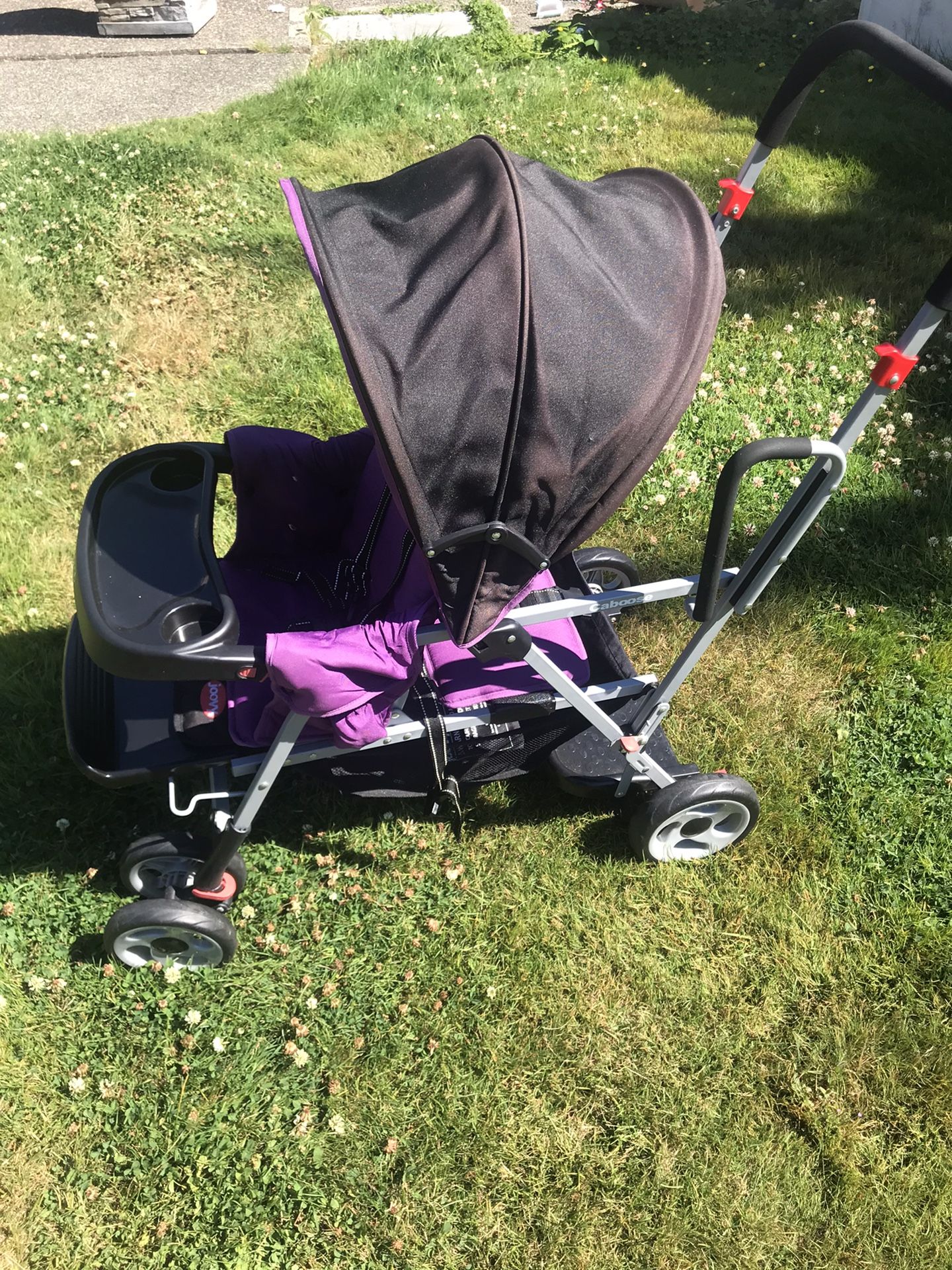 Awesome stroller for a mom of two. The stroller has a rear seat and standing platform for your older child. Loved it! My girls are too big for it now. Very clean. No pets.