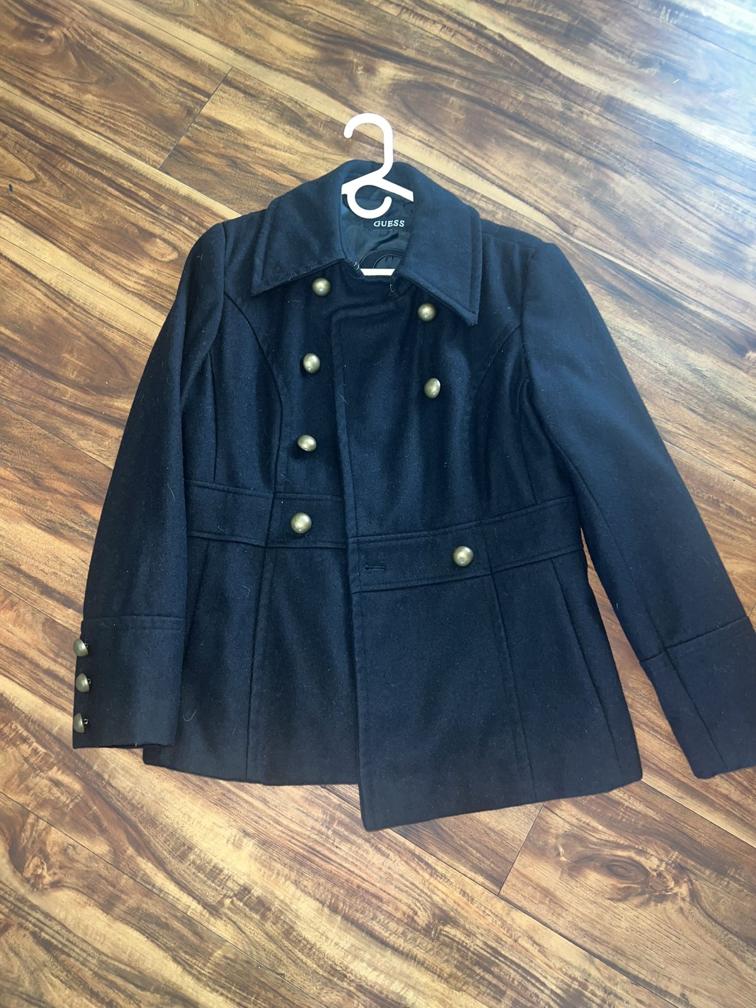 Women’s size Large Used in very good condition,double-breasted coat black wool , gold bottoms,flat pockets,interior lined Pick up in Burbank
