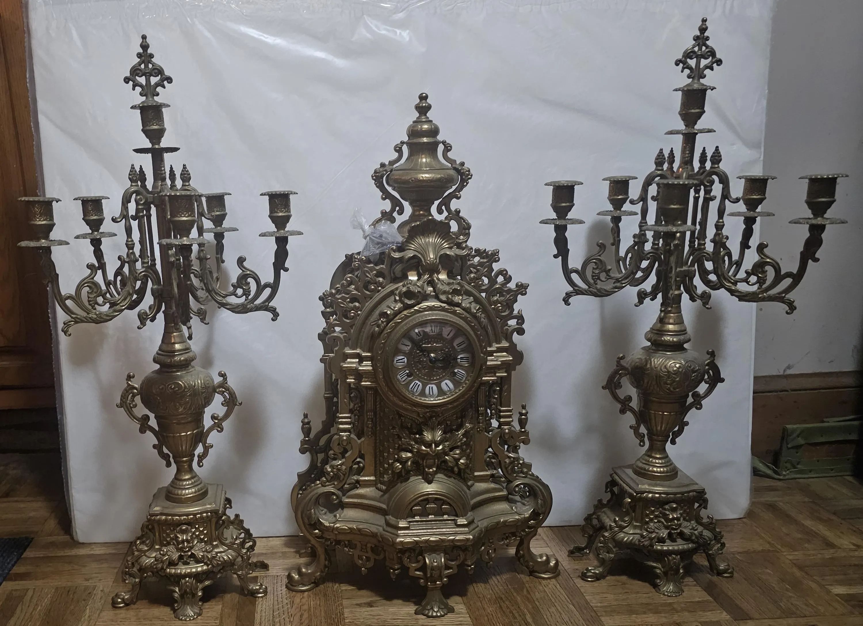 This is an Antique Solid Brass Mantle Clock, 2 Matching Candelabras with Candle Snuffers, Made in Italy, *** Shipping Cost is FREE -LOCAL PICK UP ONLY in New Castle, Delaware*** DIMENSIONS: Clock approx. 24" T 15 W x 7 D, 23.5 lbs Candelabras without Candle Snuffers approx. 24" T, Base 8" W x 6.5" D, 9 lbs, candle to candle 12.5" Candle Snuffers 3.5" T CONDITION: Very Good. considering age. Tested Works with key. Seller reserves all cleaning to buyer.