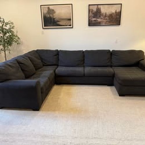This expansive U-shaped sectional sofa offers ample seating for the whole family. Upholstered in a durable, dark gray fabric, it features a comfortable chaise lounge on one end, perfect for relaxing. The clean lines and modern silhouette make it a versatile piece for any contemporary living space. Its plush, loose back cushions provide a cozy feel, while the sturdy construction ensures long-lasting comfort and style for your home.
